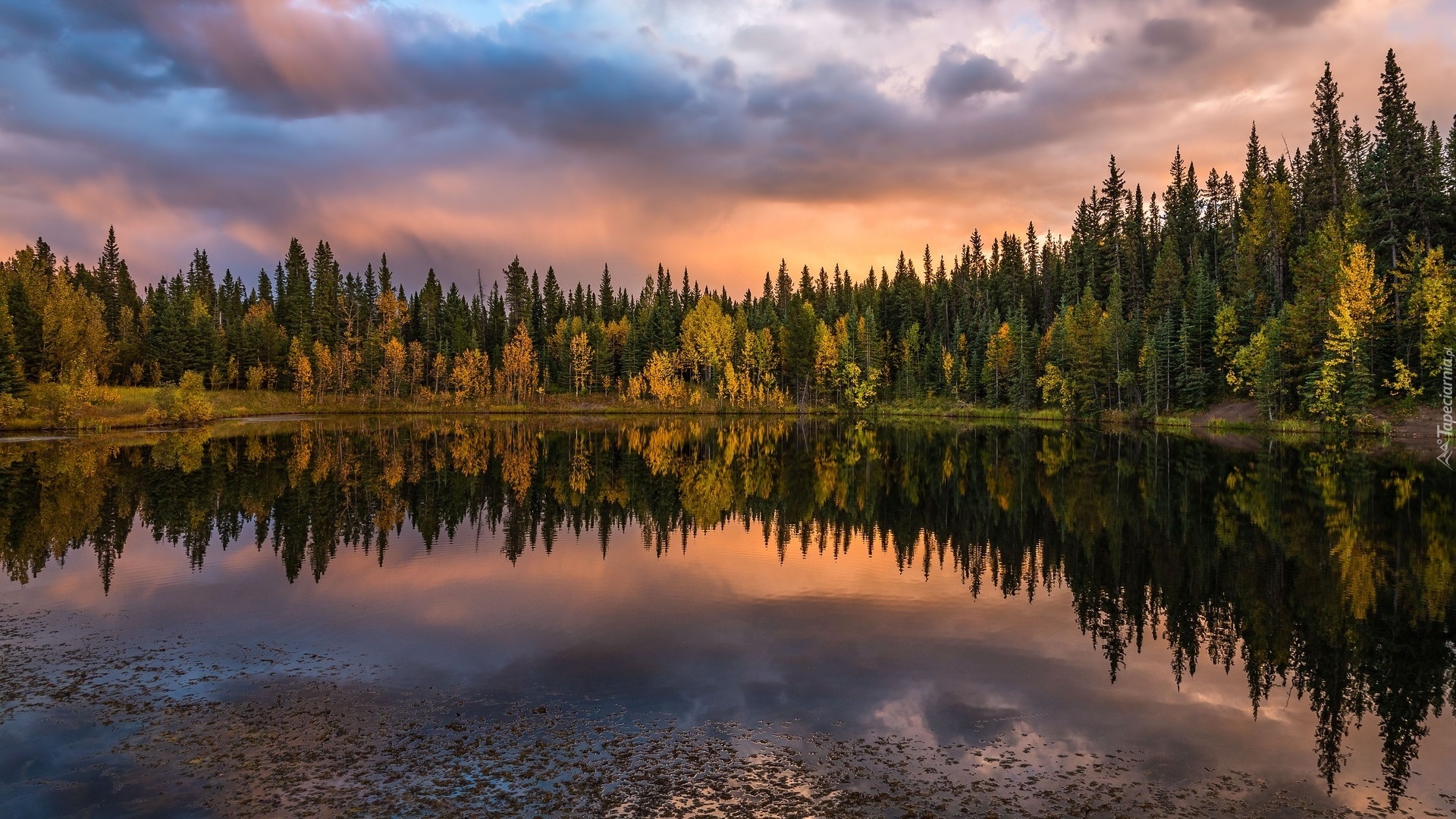 Edytor tapety: Ciemne chmury nad lasem i jeziorem