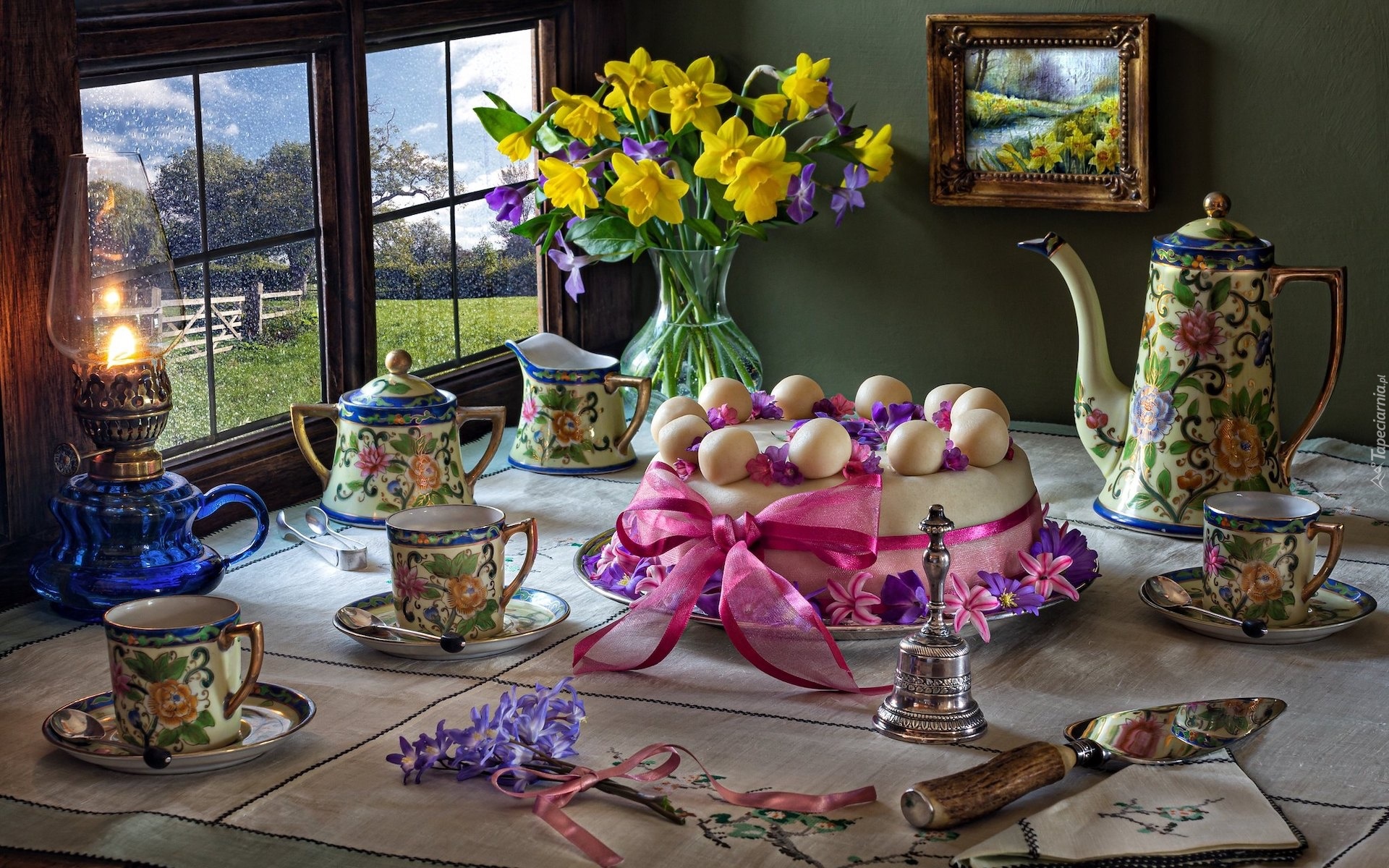 Edytor tapety: Bukiet żonkili obok serwisu kawowego i lampy