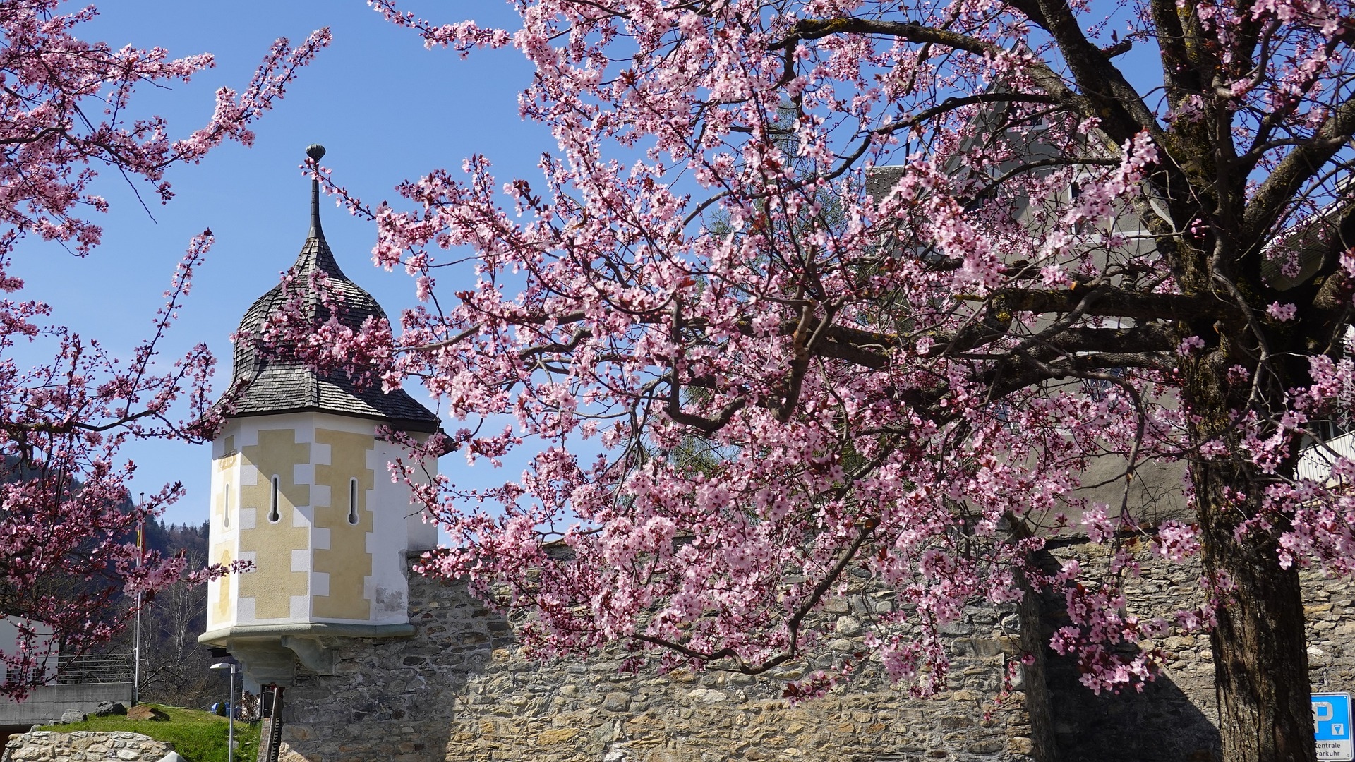 Edytor tapety: Kwitnące drzewa owocowe przy baszcie na murach obronnych