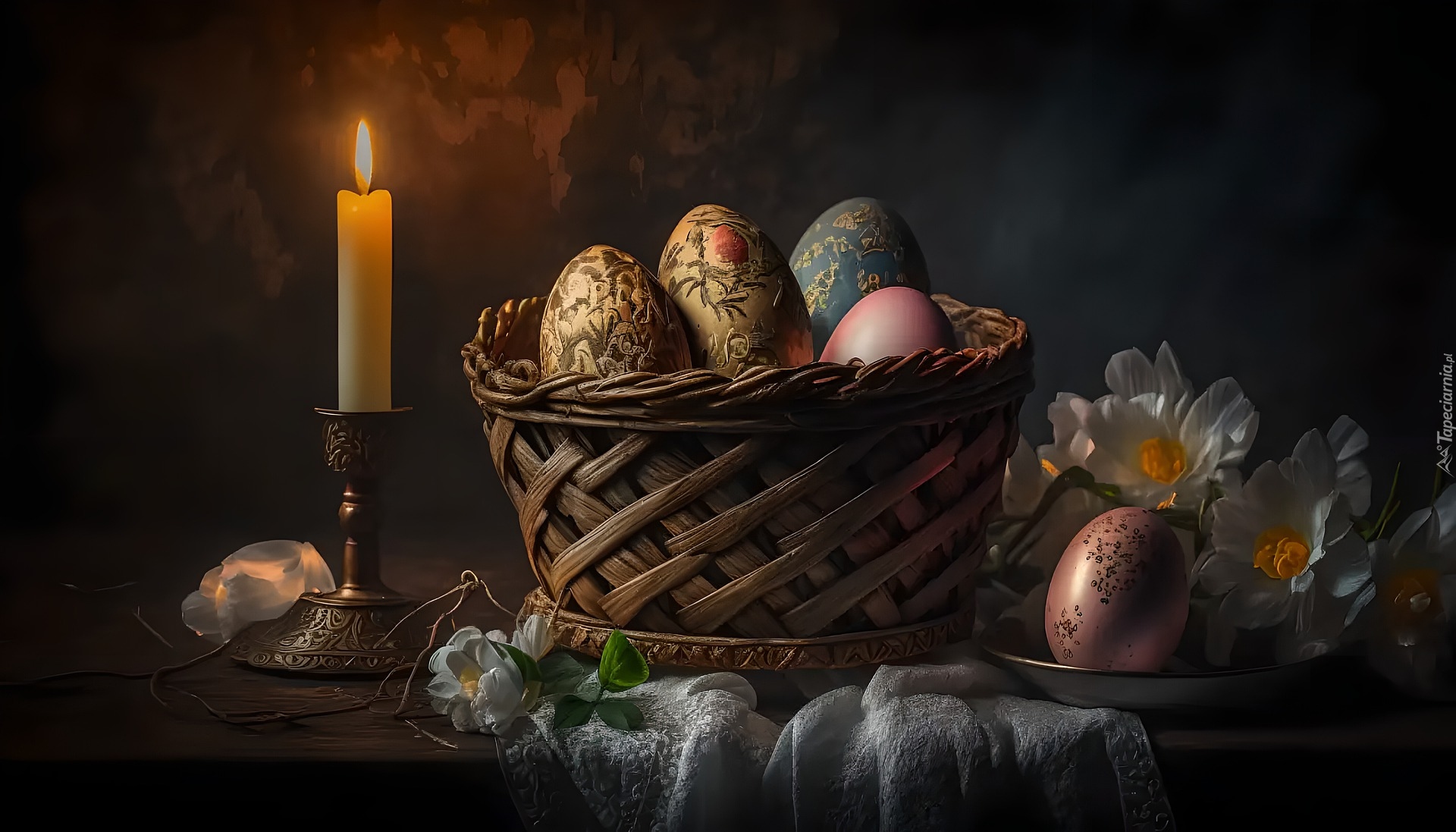 Edytor tapety: Świeczka obok pisanek w koszyku