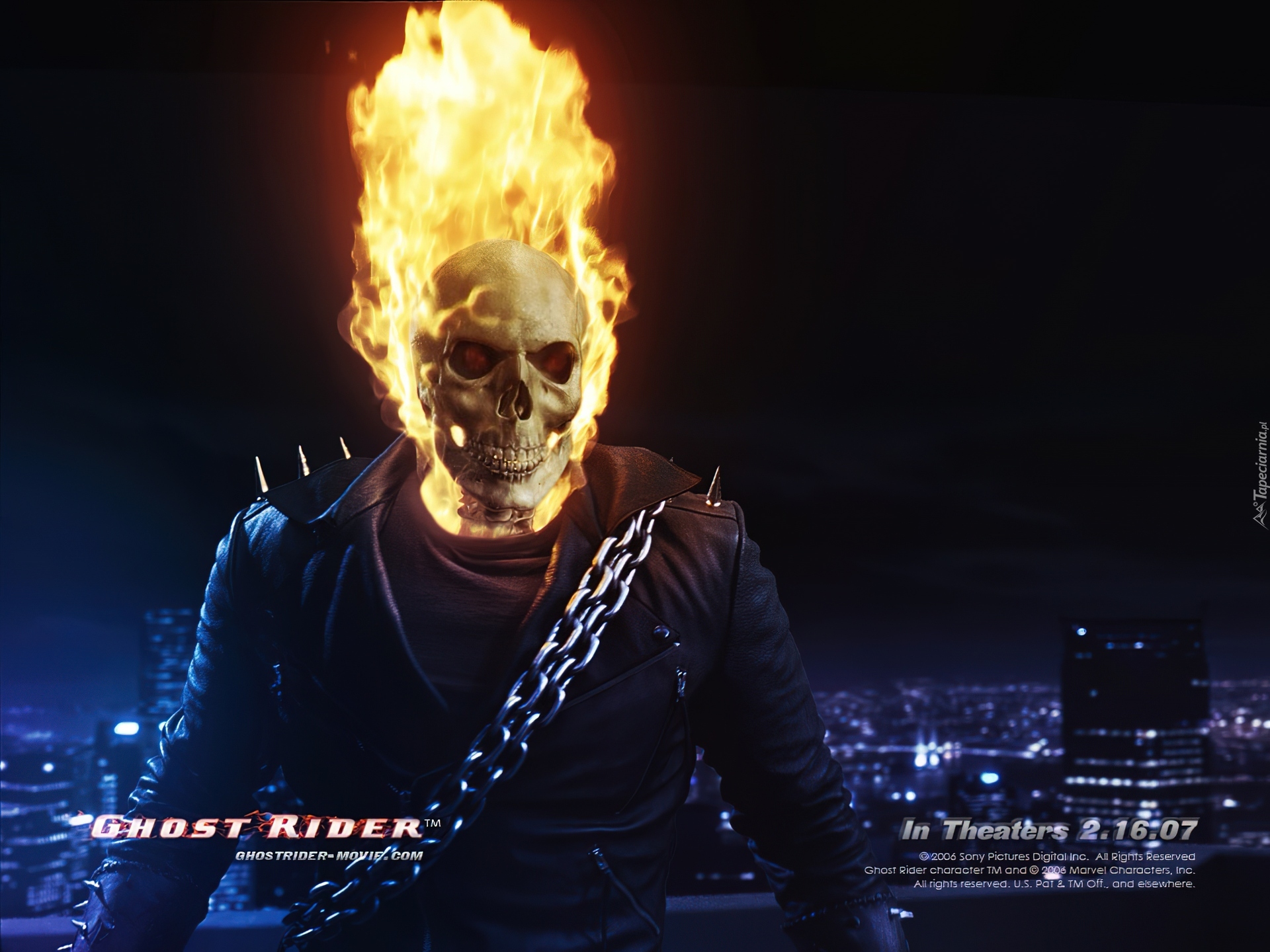 Edytor tapety: Ghost Rider, czaszka, płonie, łańcuch, miasto