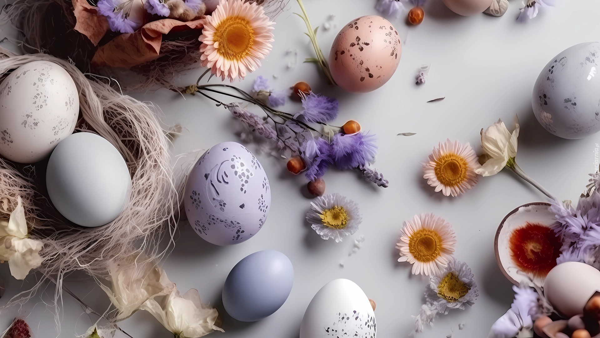 Edytor tapety: Pisanki w gniazdu i obok na stole