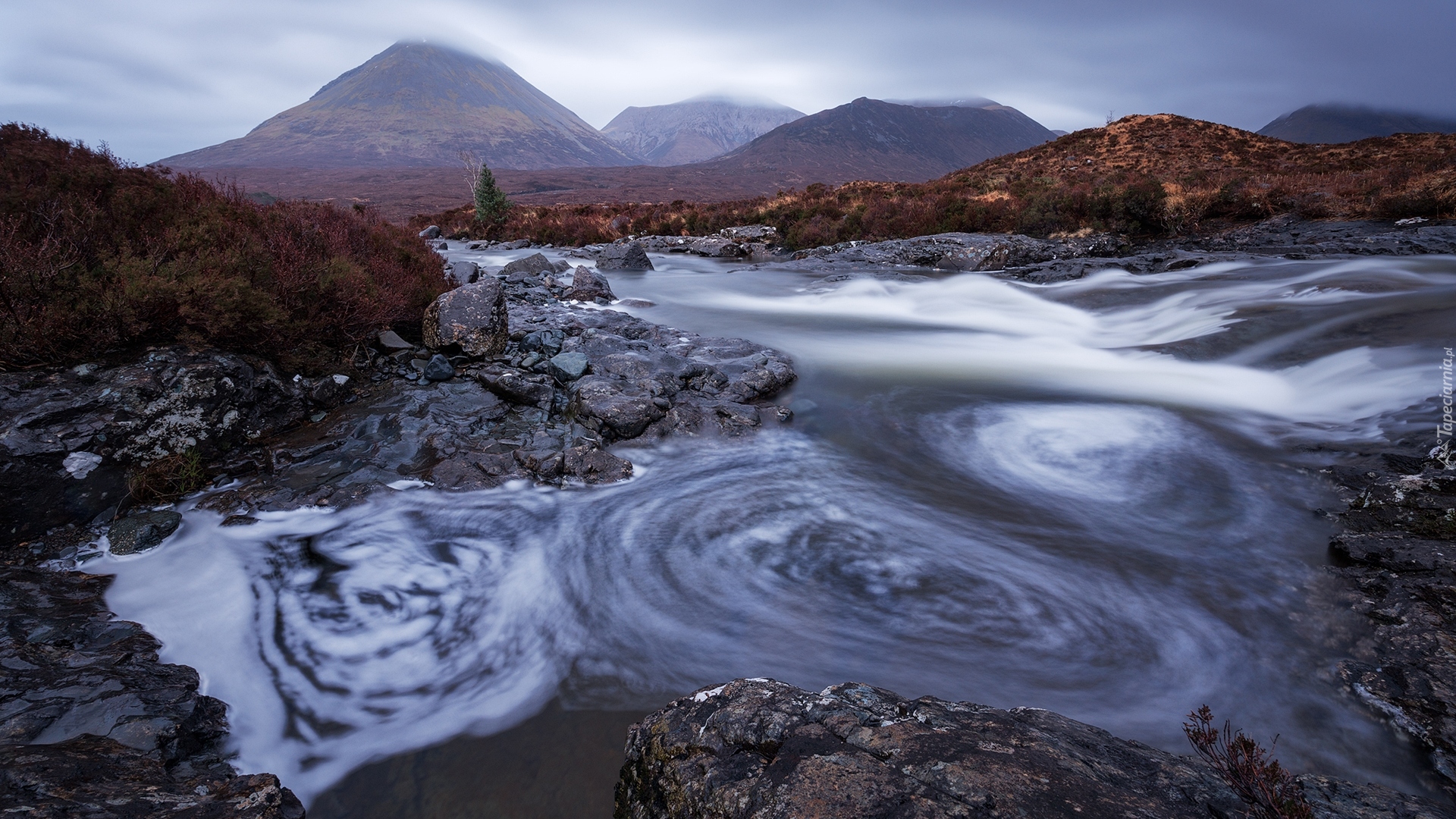 Edytor tapety: Chmury nad górami i rzeką na wyspie Skye