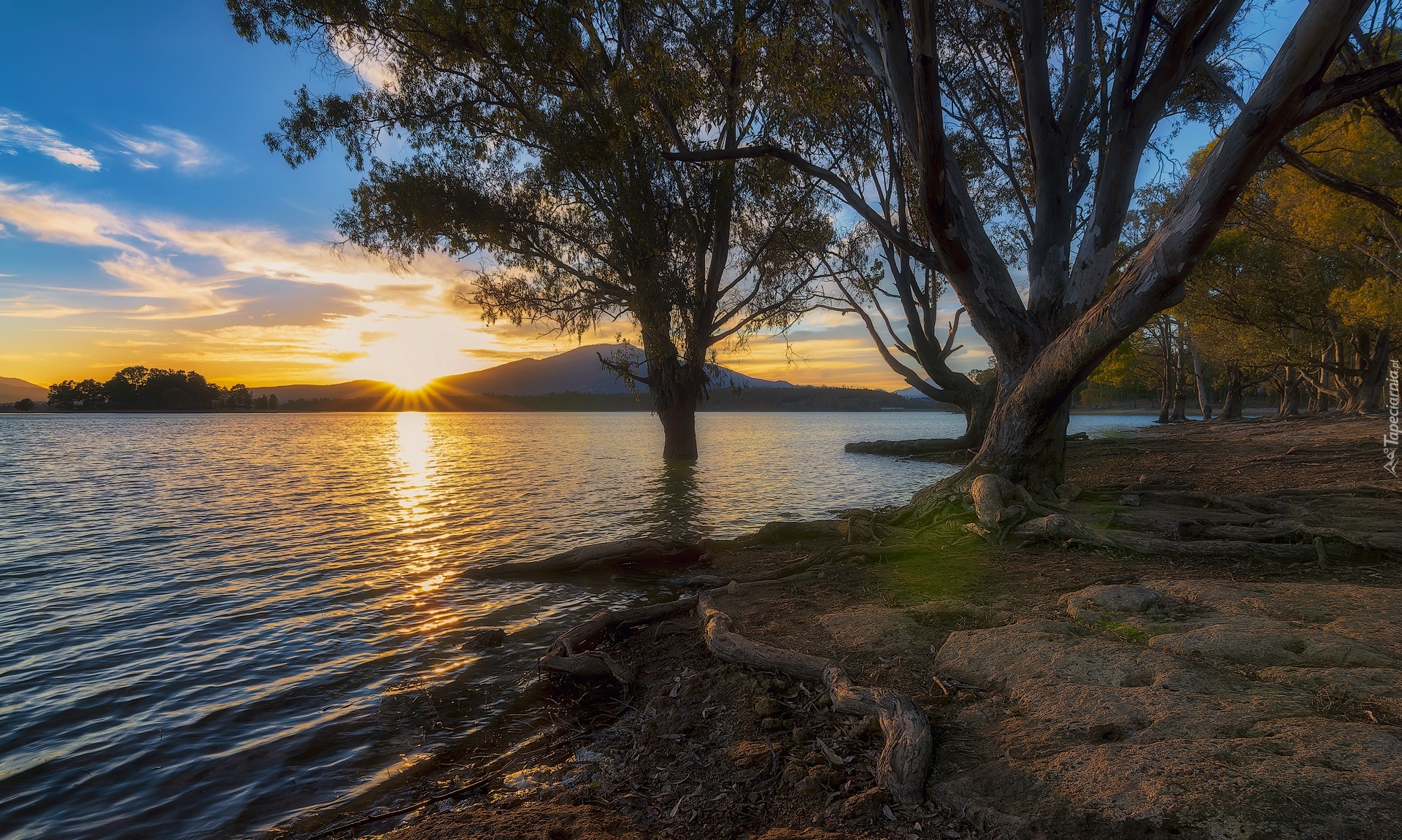 Edytor tapety: Drzewa na brzegu jeziora w blasku wschodzącego słońca