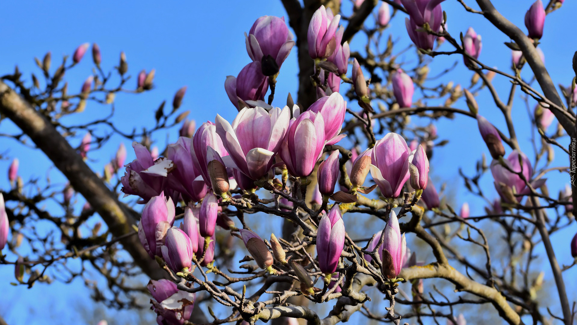 Edytor tapety: Rozkwitające kwiaty magnolii na gałęziach