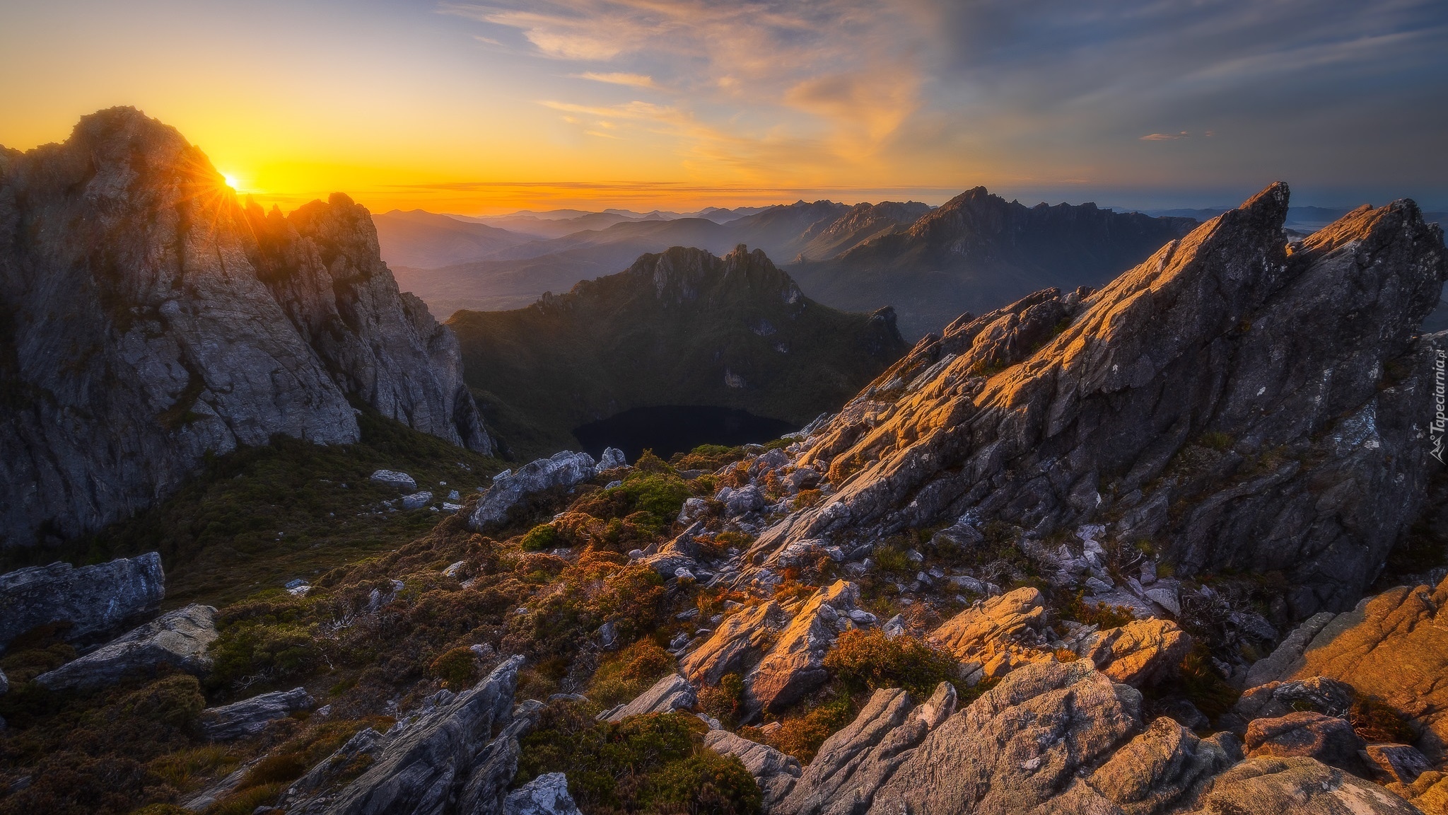 Edytor tapety: Rozświetlone blaskiem zachodzącego słońca góry Arthur Range