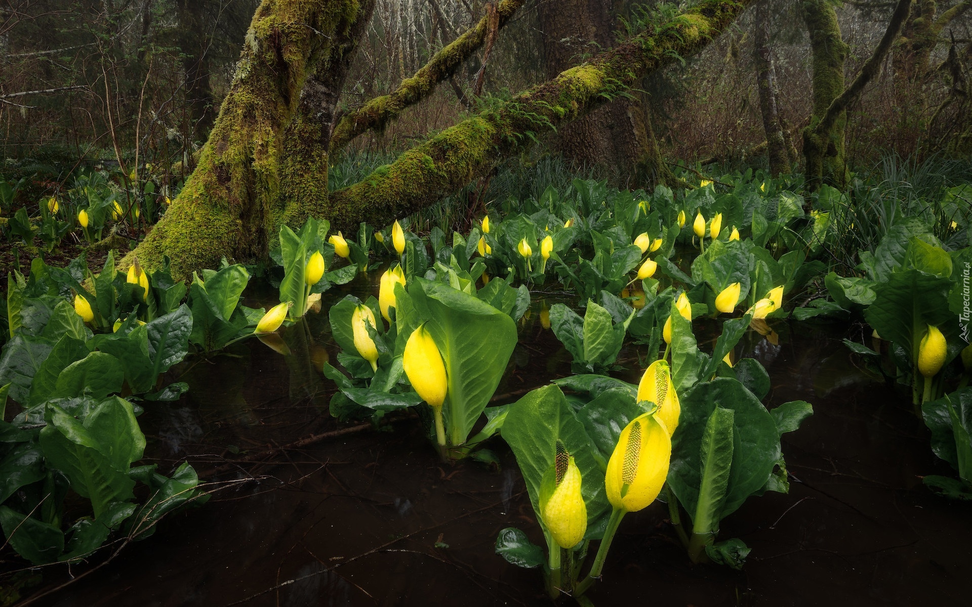 Edytor tapety: Kwiaty tulejnika amerykańskiego pod omszałym drzewem