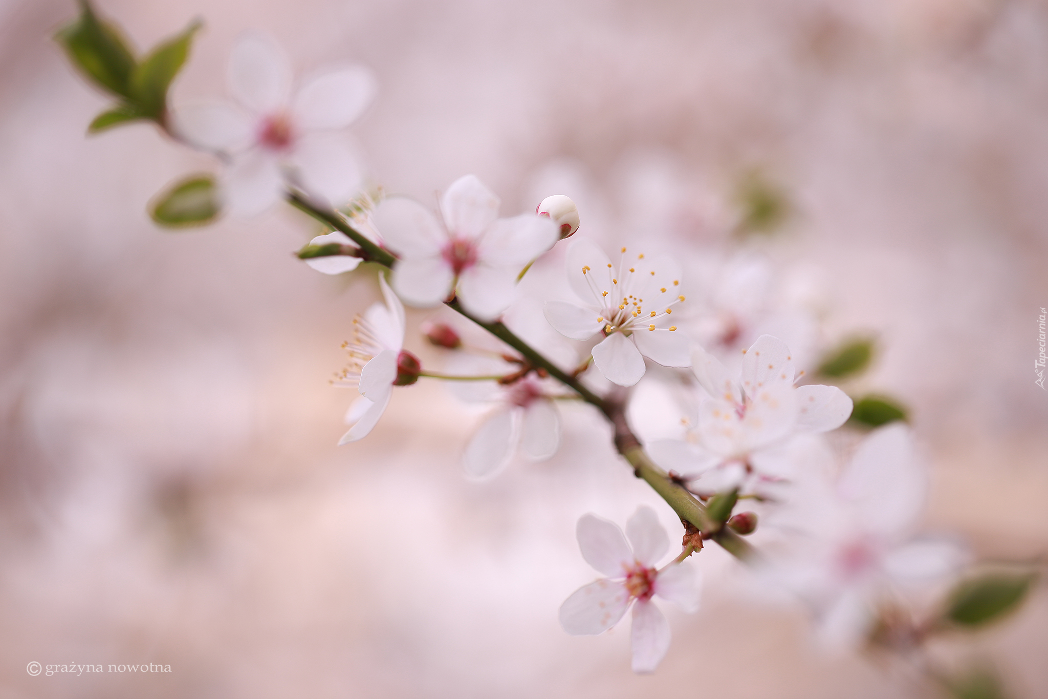 Edytor tapety: Rozmyte tło i białe kwiaty drzewa owocowego