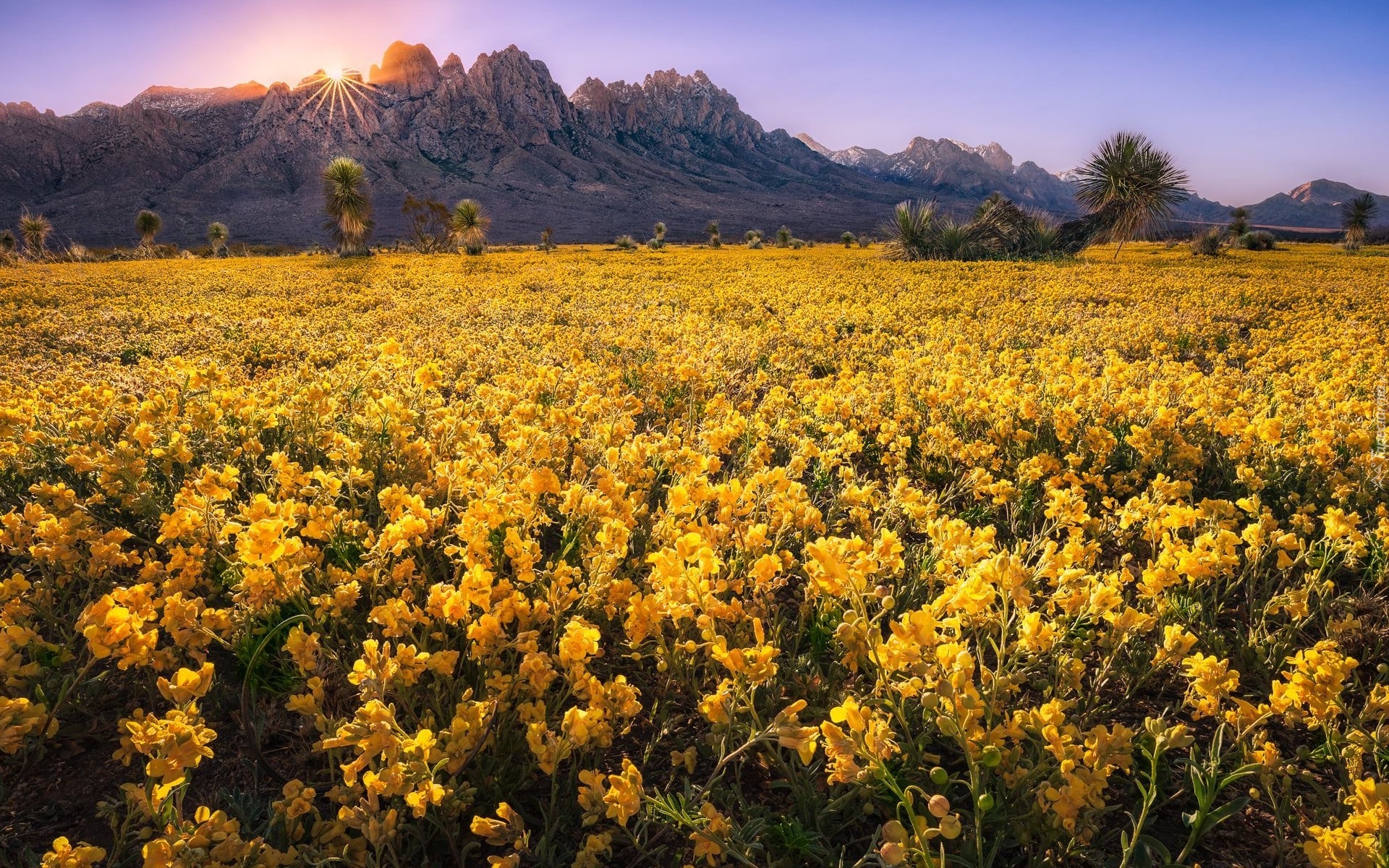 Edytor tapety: Rozświetlone promieniami słońca żółte kwiaty pod górami