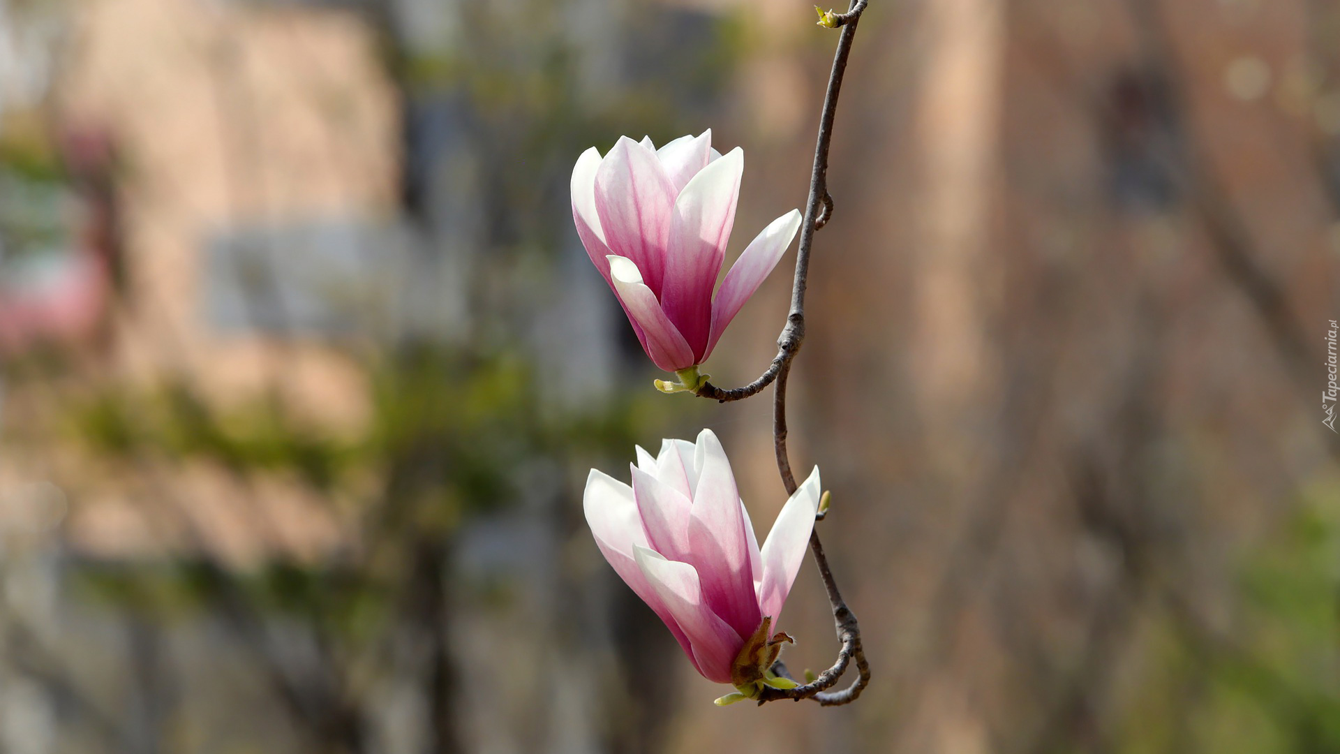 Edytor tapety: Dwa biało-różowe kwiaty magnolii na gałązce