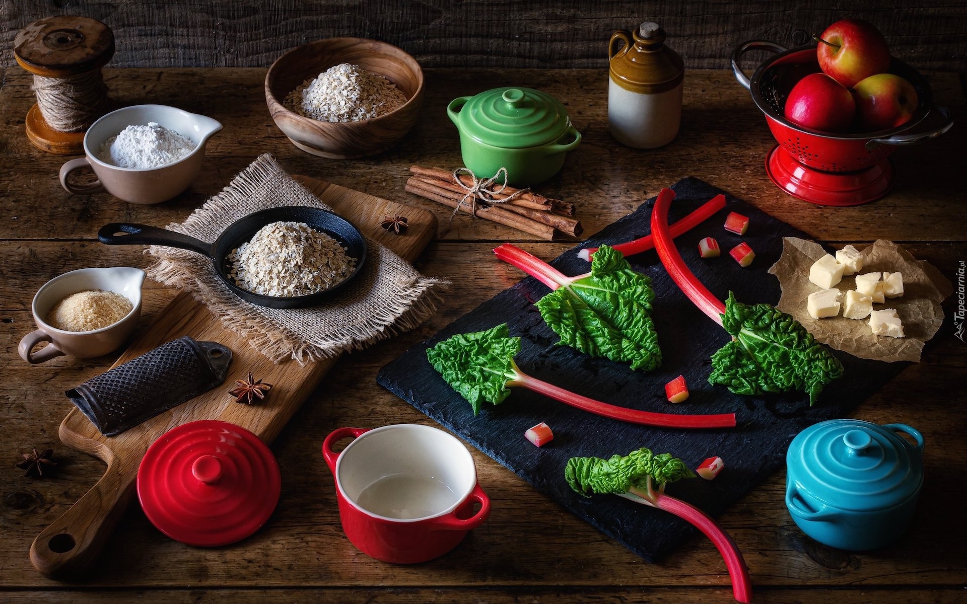 Edytor tapety: Rabarbar obok naczyń i deski na stole