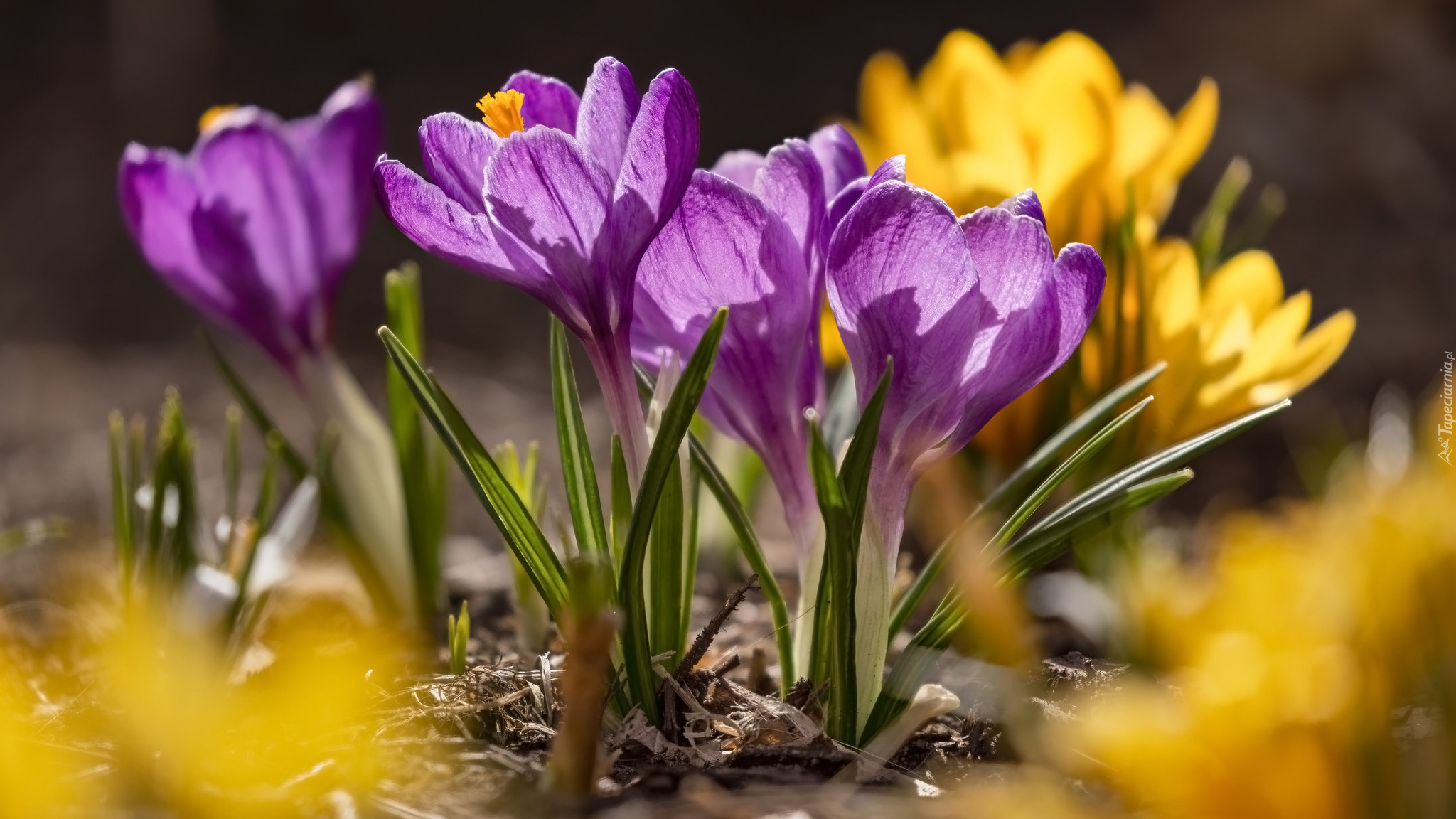 Edytor tapety: Rozświetlone rozwinięte żółte i fioletowe krokusy