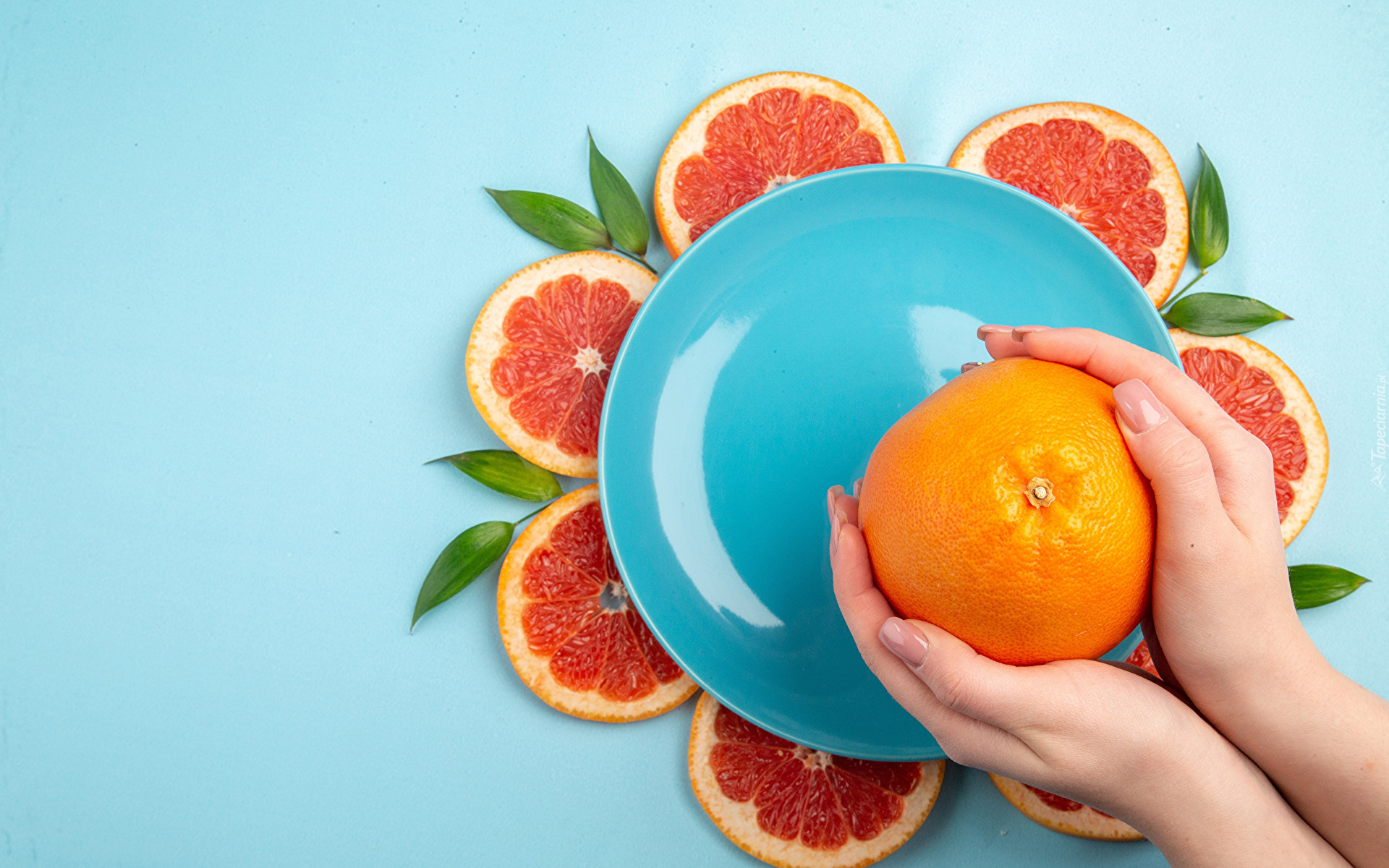 Edytor tapety: Dłonie trzymające pomarańczę nad talerzem