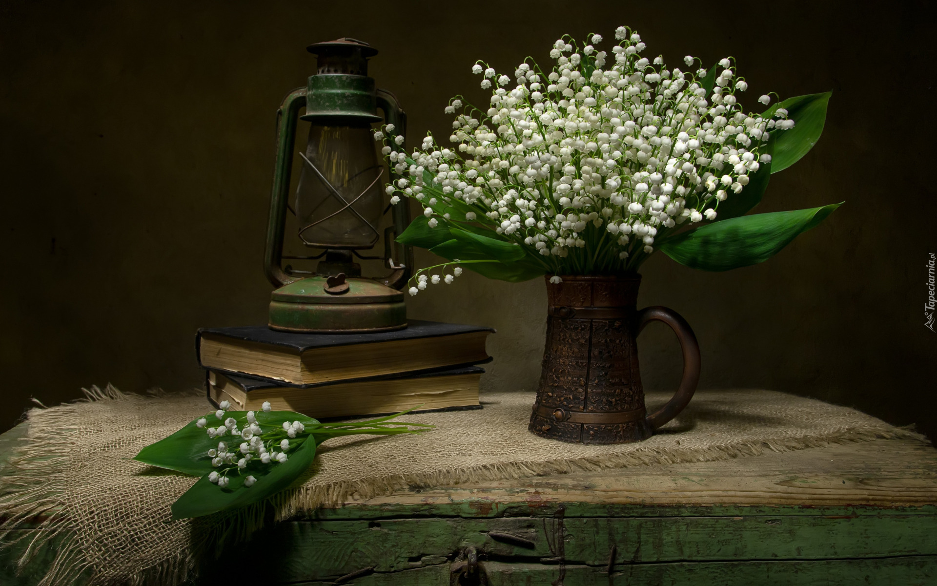 Edytor tapety: Bukiet konwalii w dzbanku obok lampy i książek