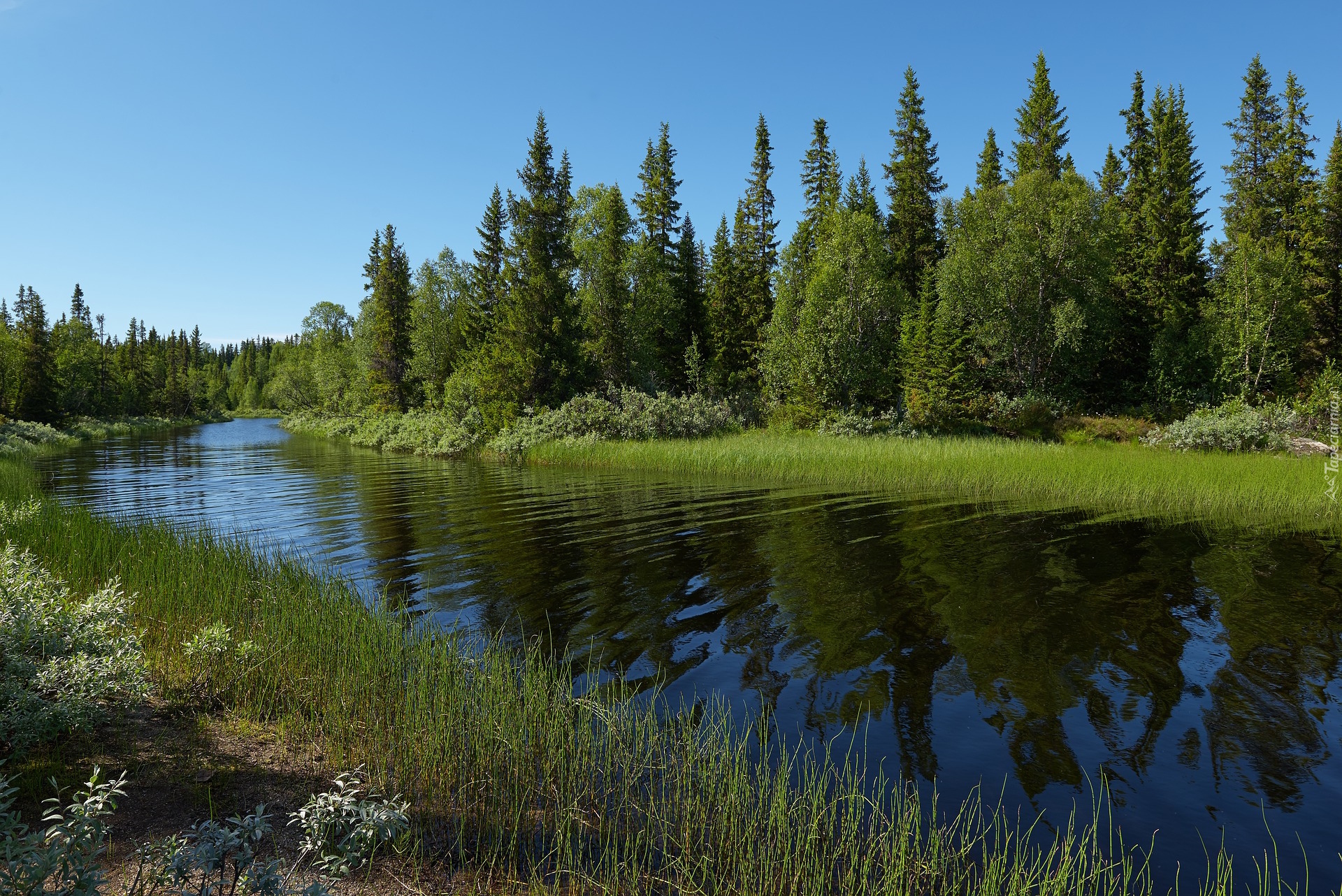 Edytor tapety: Szuwary i drzewa po obu stronach rzeki