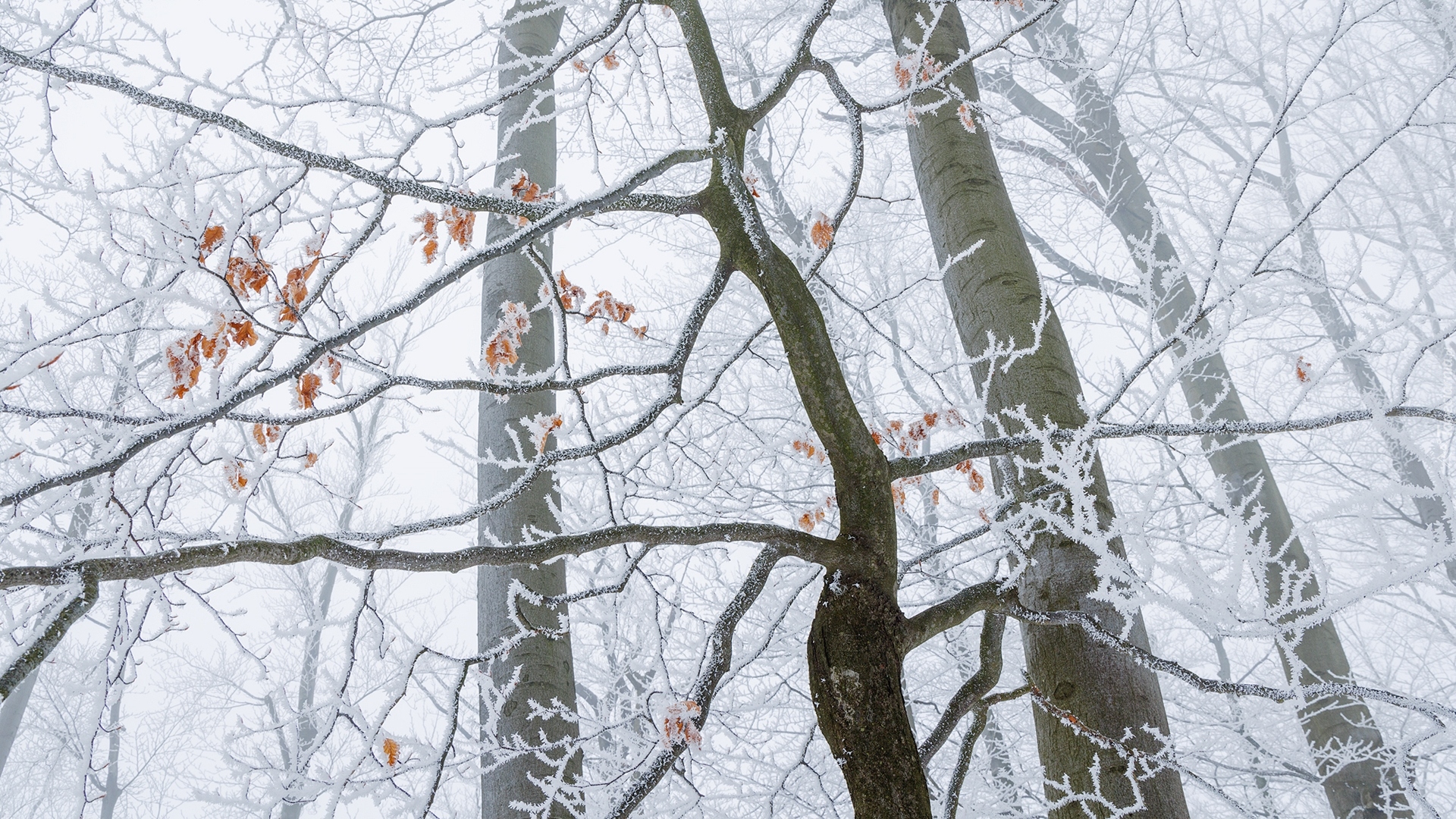 Edytor tapety: Oszronione liście na drzewie w zamglonym lesie