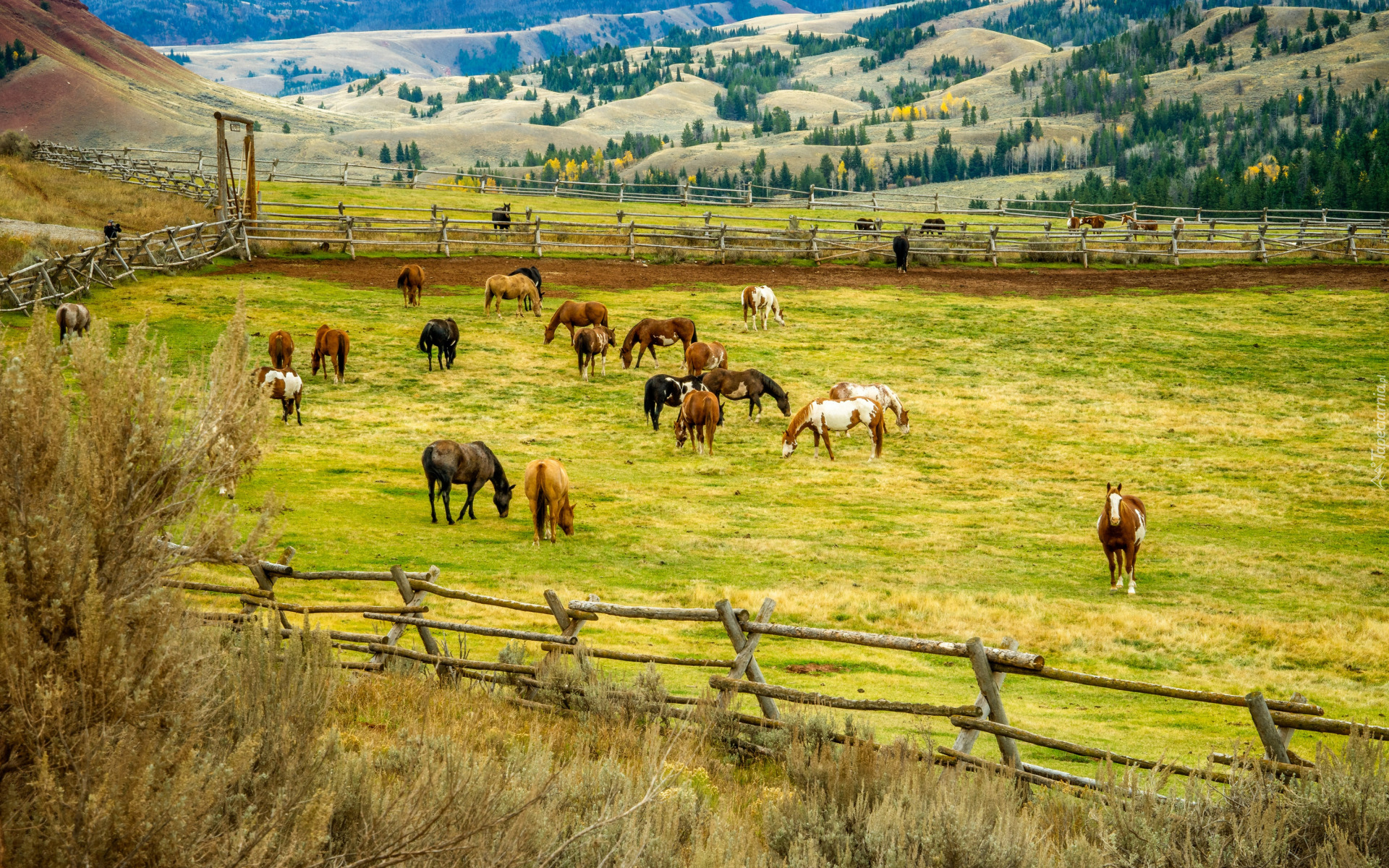 Edytor tapety: Konie na ogrodzonym pastwisku
