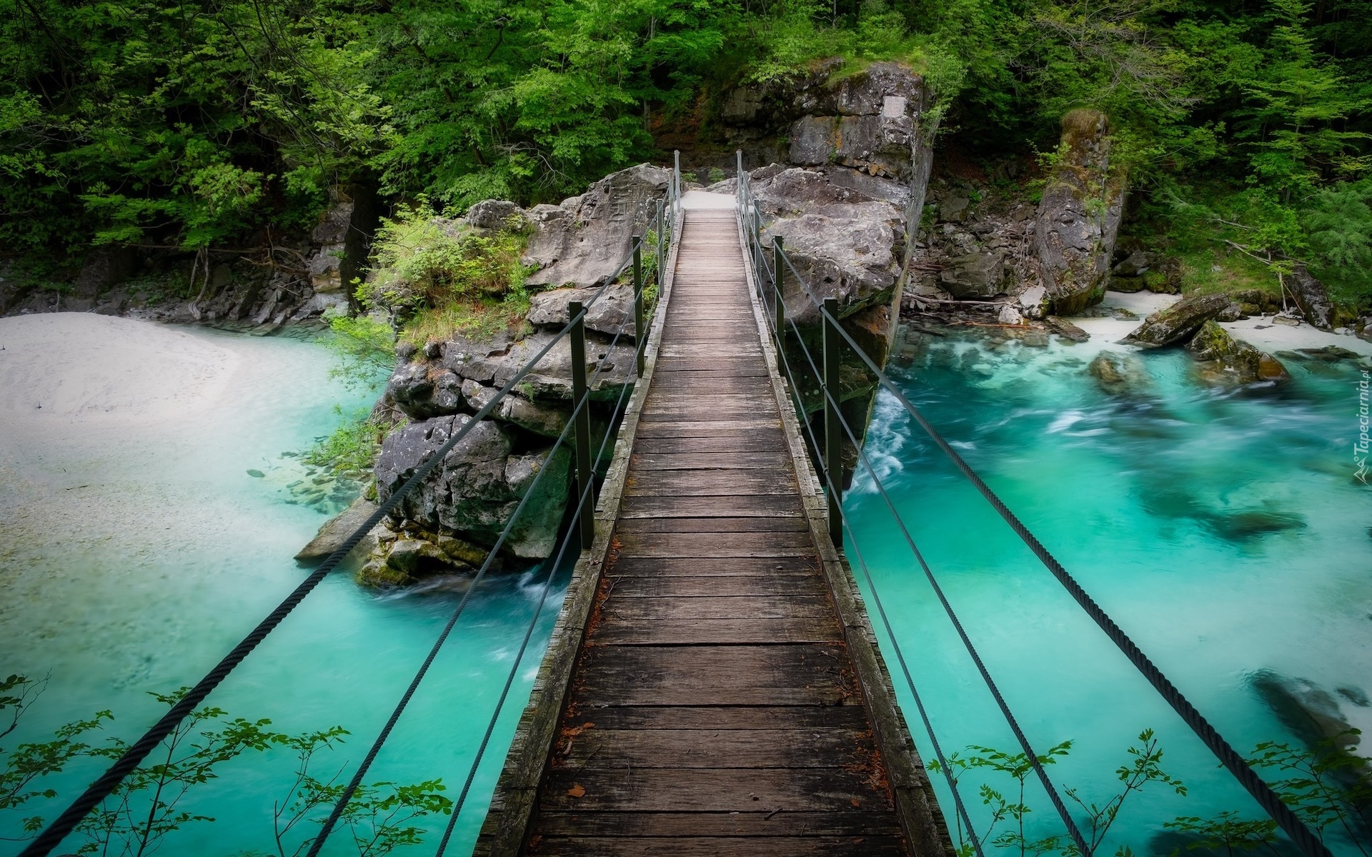 Edytor tapety: Drewniany most na rzece Socza w Słowenii
