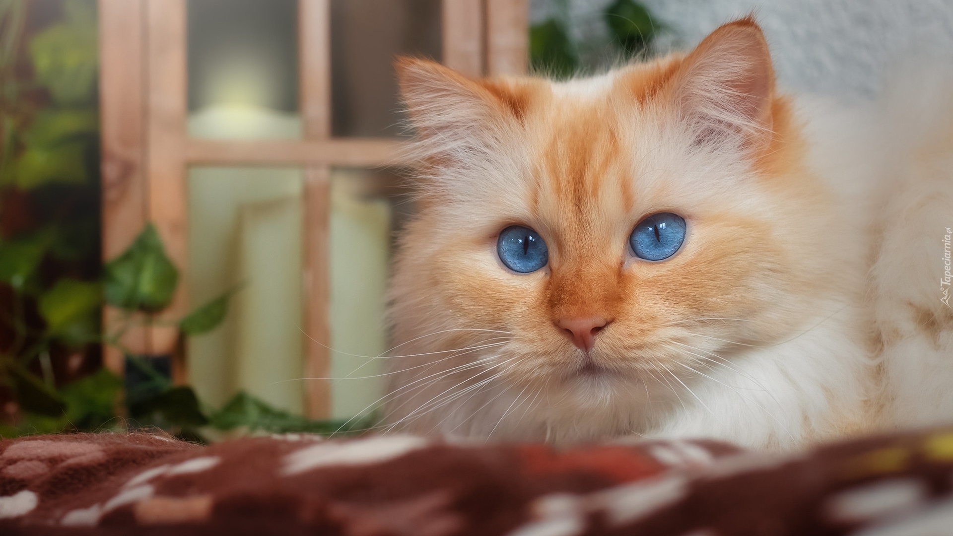 Edytor tapety: Niebieskooki rudawy kot na kocu
