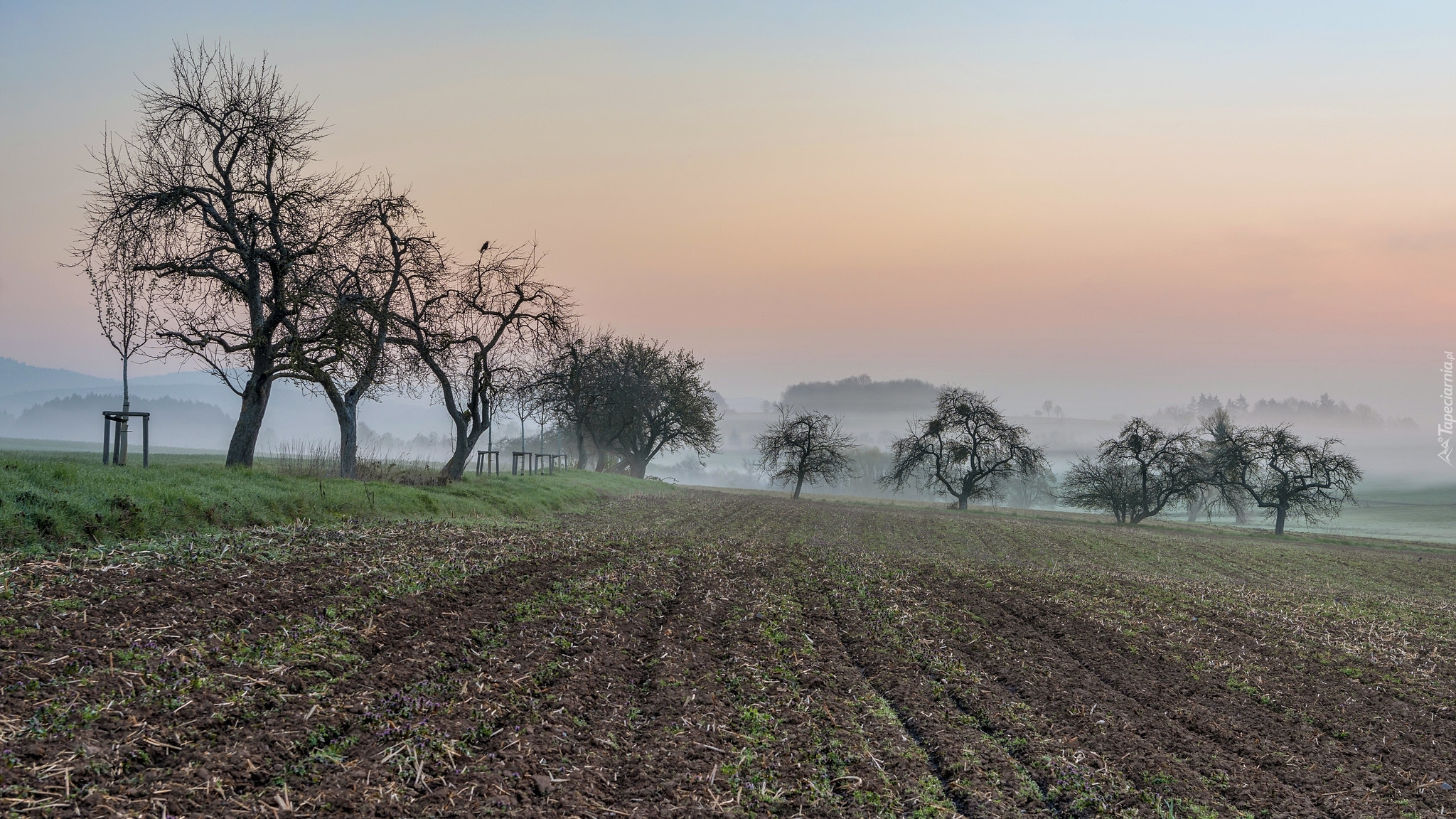 Edytor tapety: Drzewa na polu w opadającej mgle