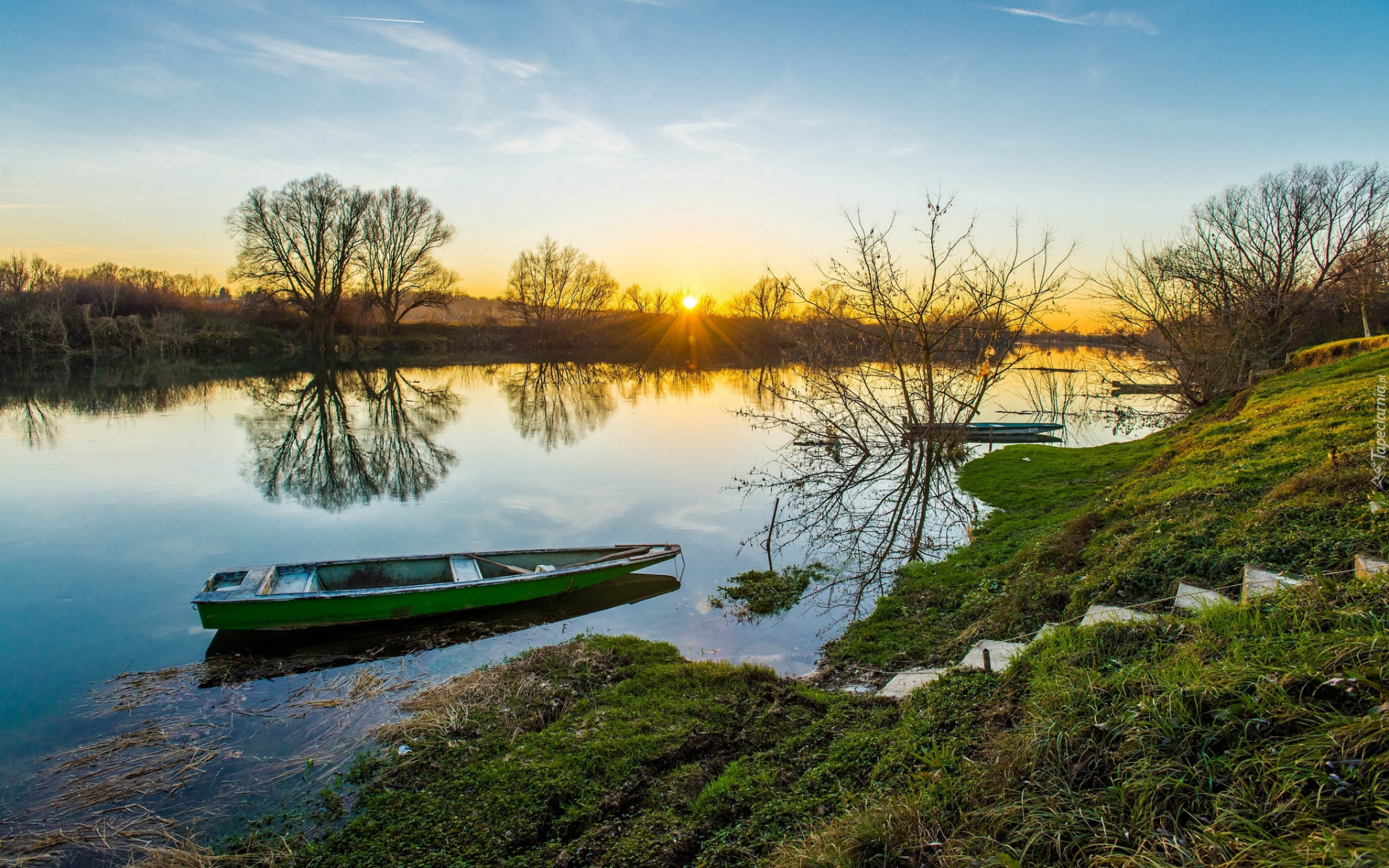 Edytor tapety: Łódki na rzece w blasku zachodzącego słońca