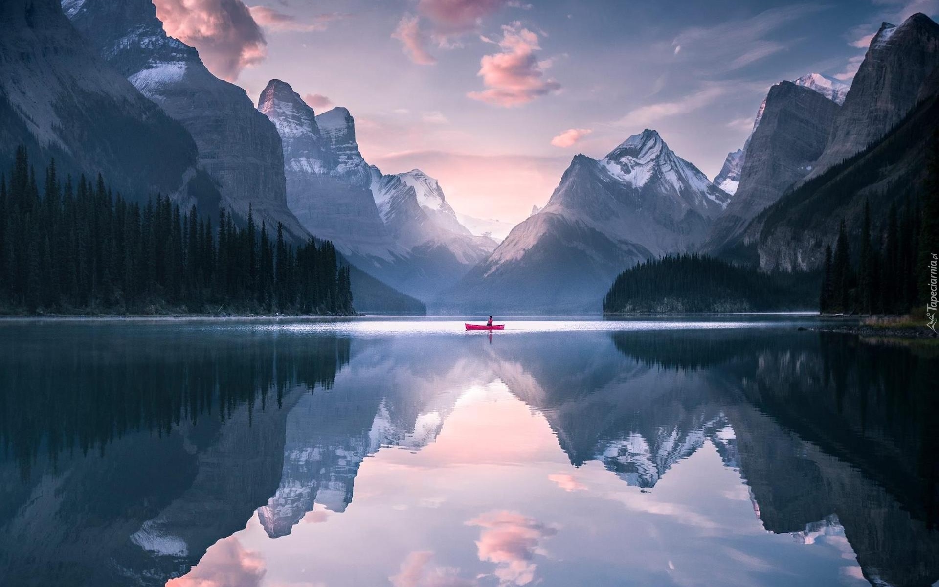 Edytor tapety: Czerwona łódka na górskim jeziorze