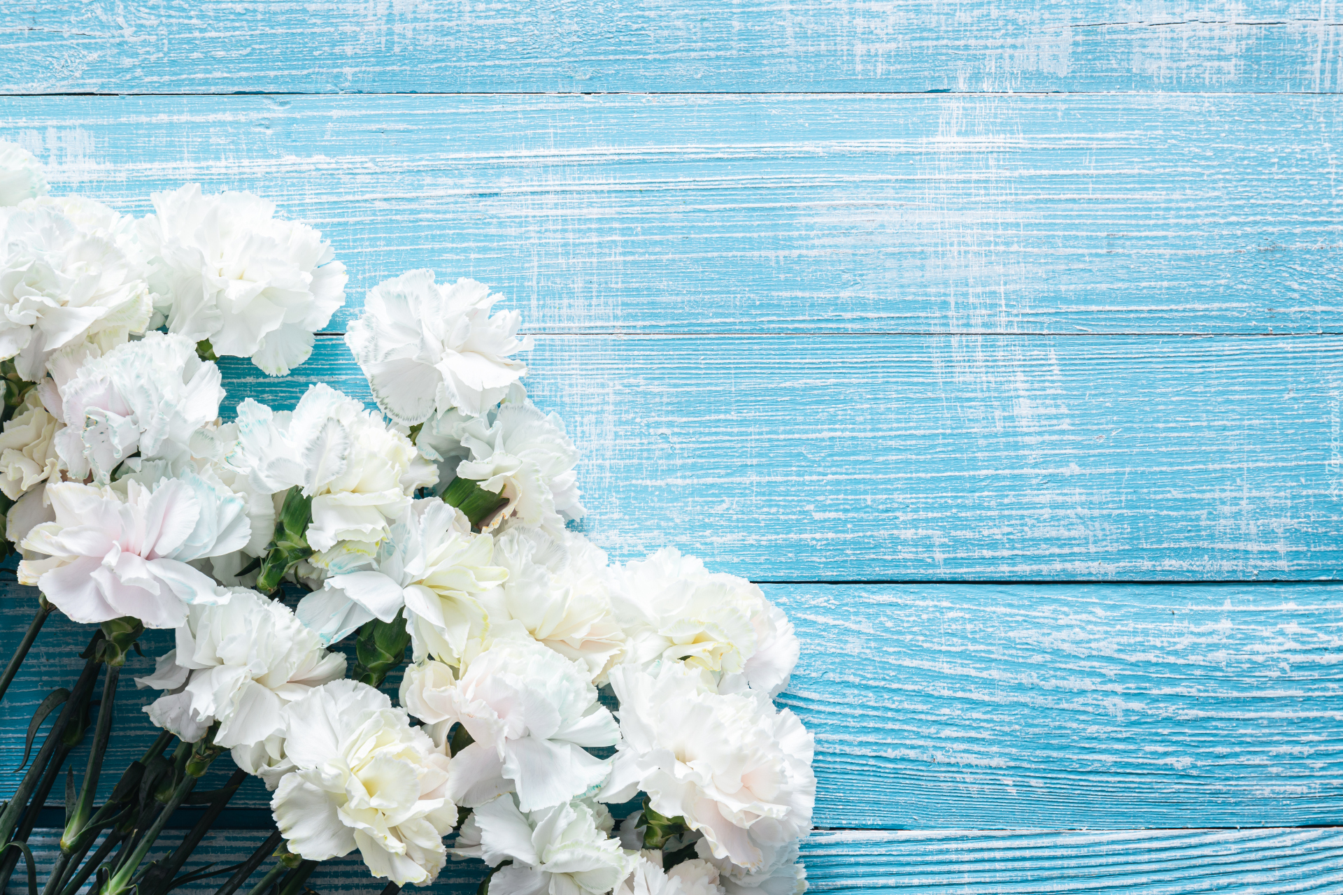 Edytor tapety: Białe goździki na niebieskich deskach