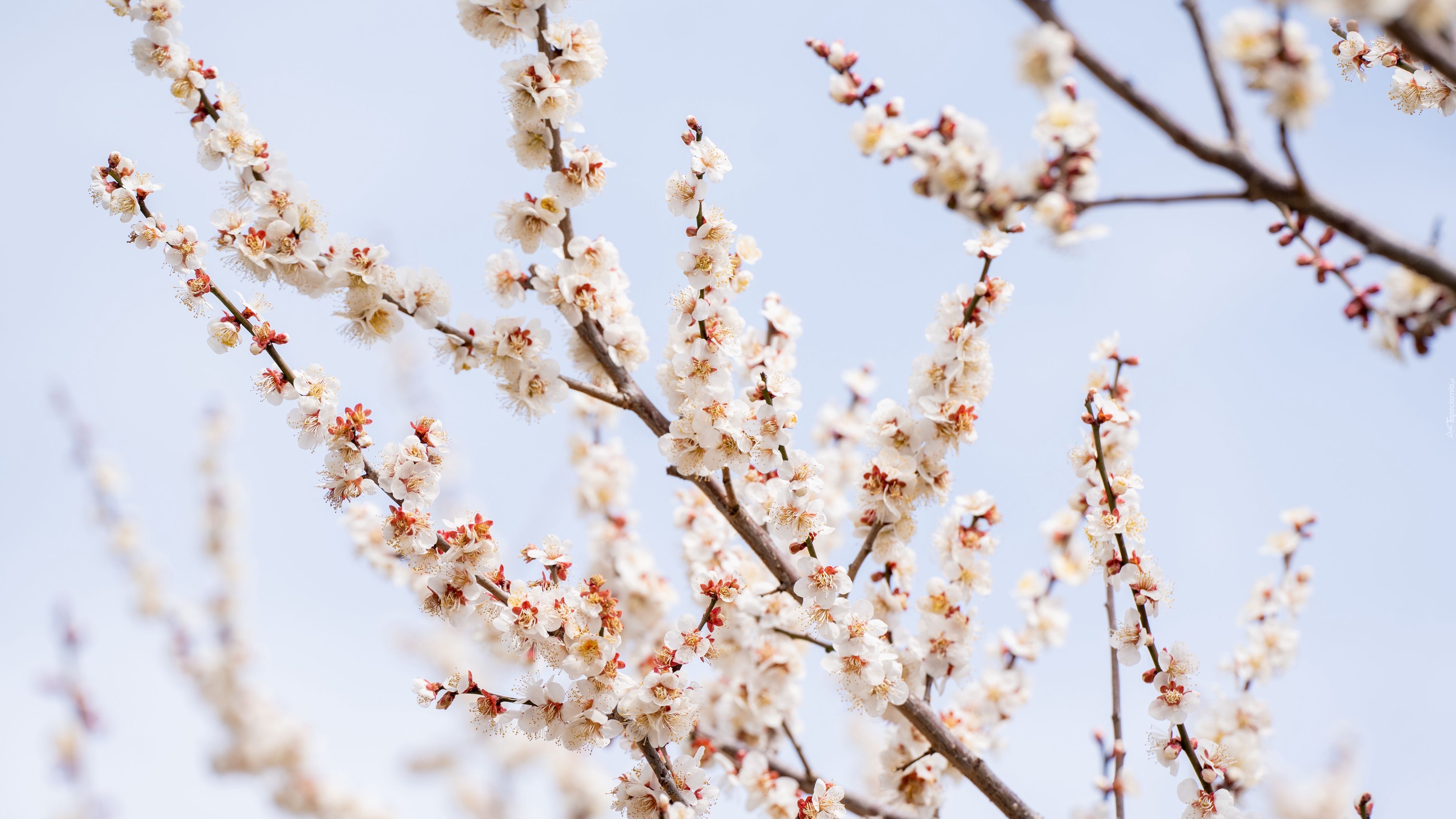 Edytor tapety: Okwiecone białymi kwiatami gałązki drzewa owocowego