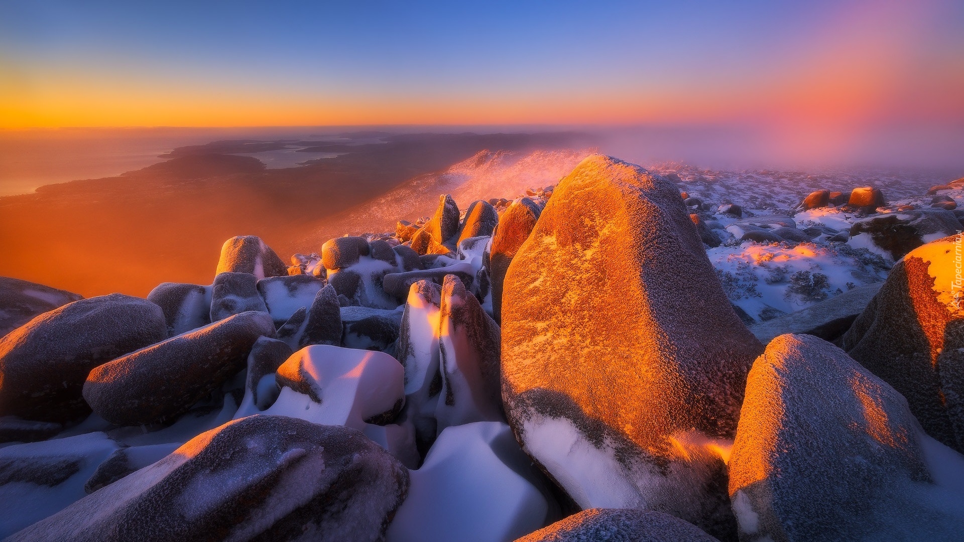 Edytor tapety: Rozświetlone słońcem ośnieżone kamienie