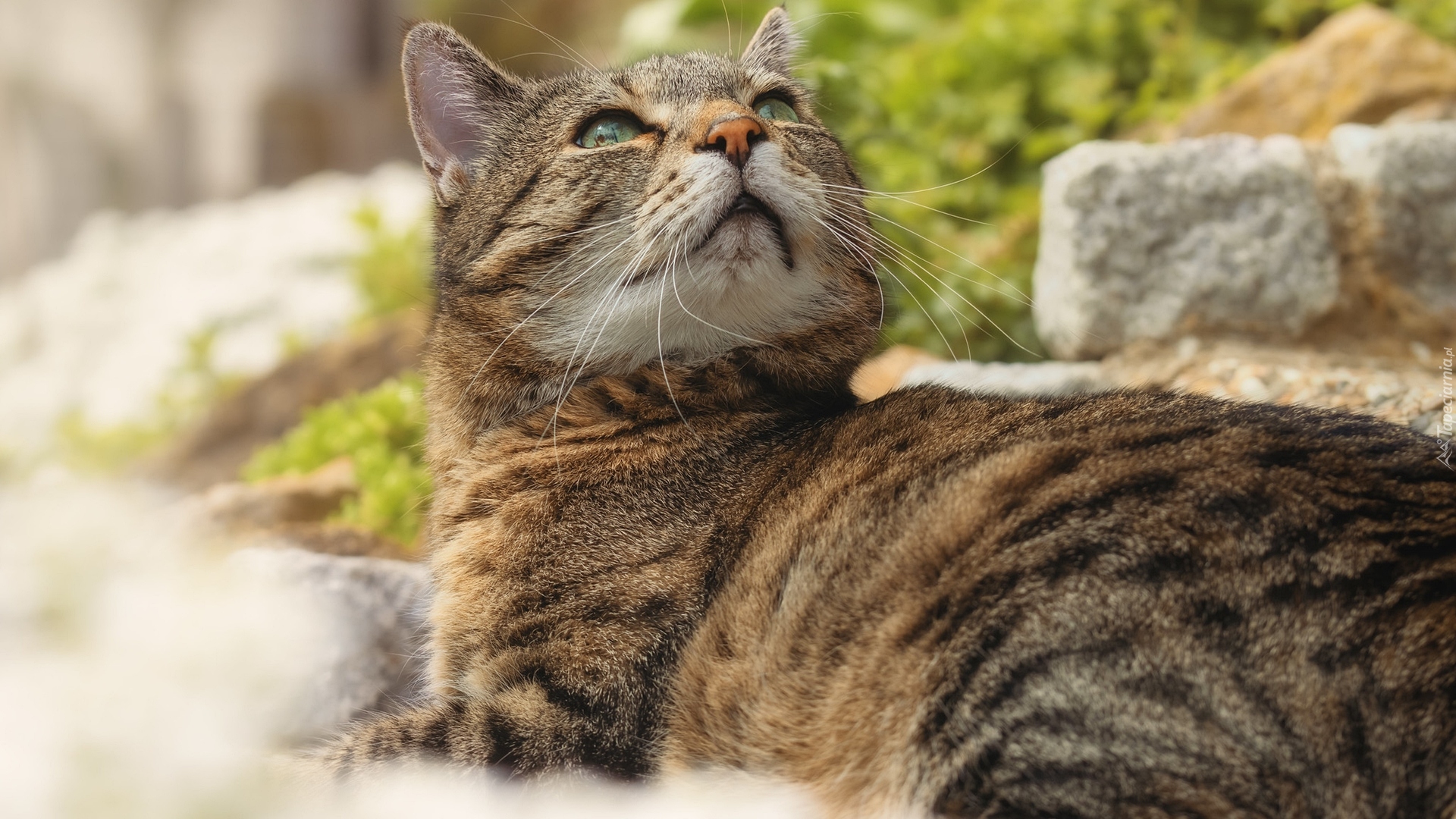 Edytor tapety: Szaro-bury kot patrzący w górę