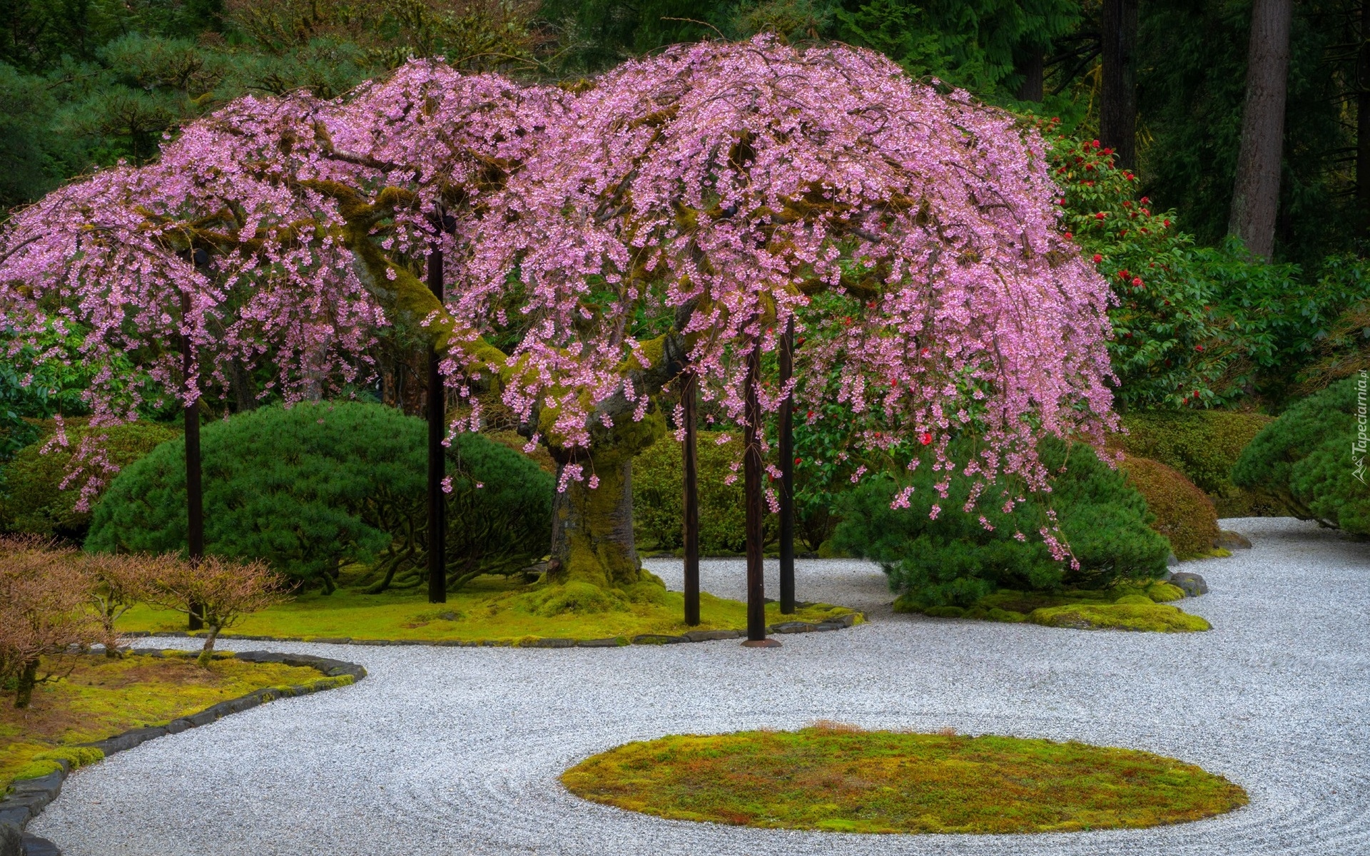 Edytor tapety: Kwitnące różowe drzewa w ogrodzie japońskim