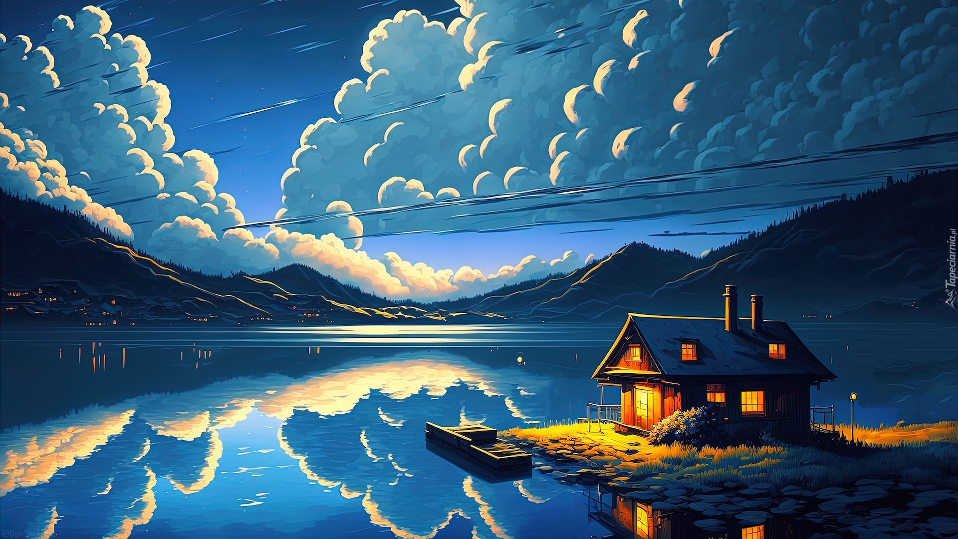 Edytor tapety: Oświetlony dom i chmury nad jeziorem w 2D
