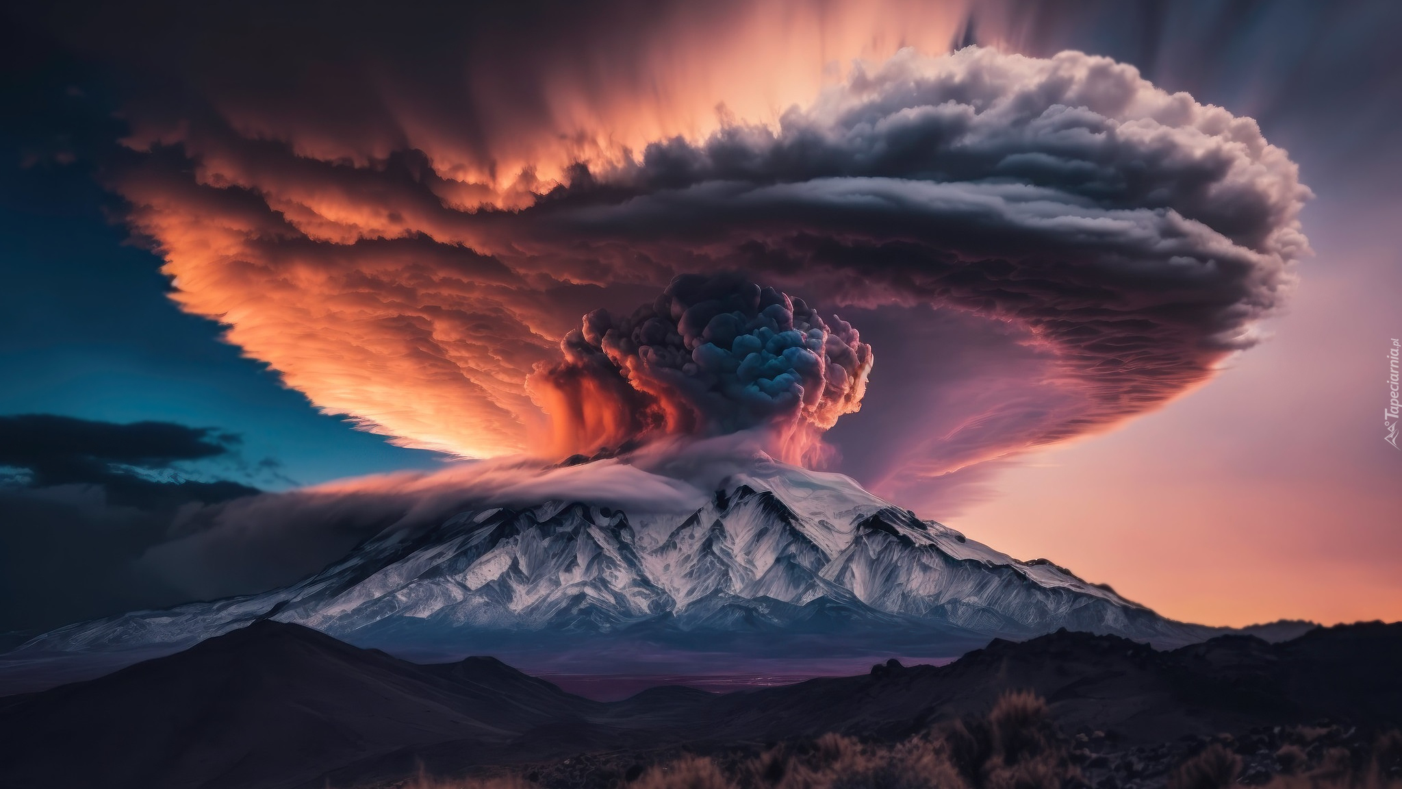 Edytor tapety: Erupcja wulkanu na tle nieba
