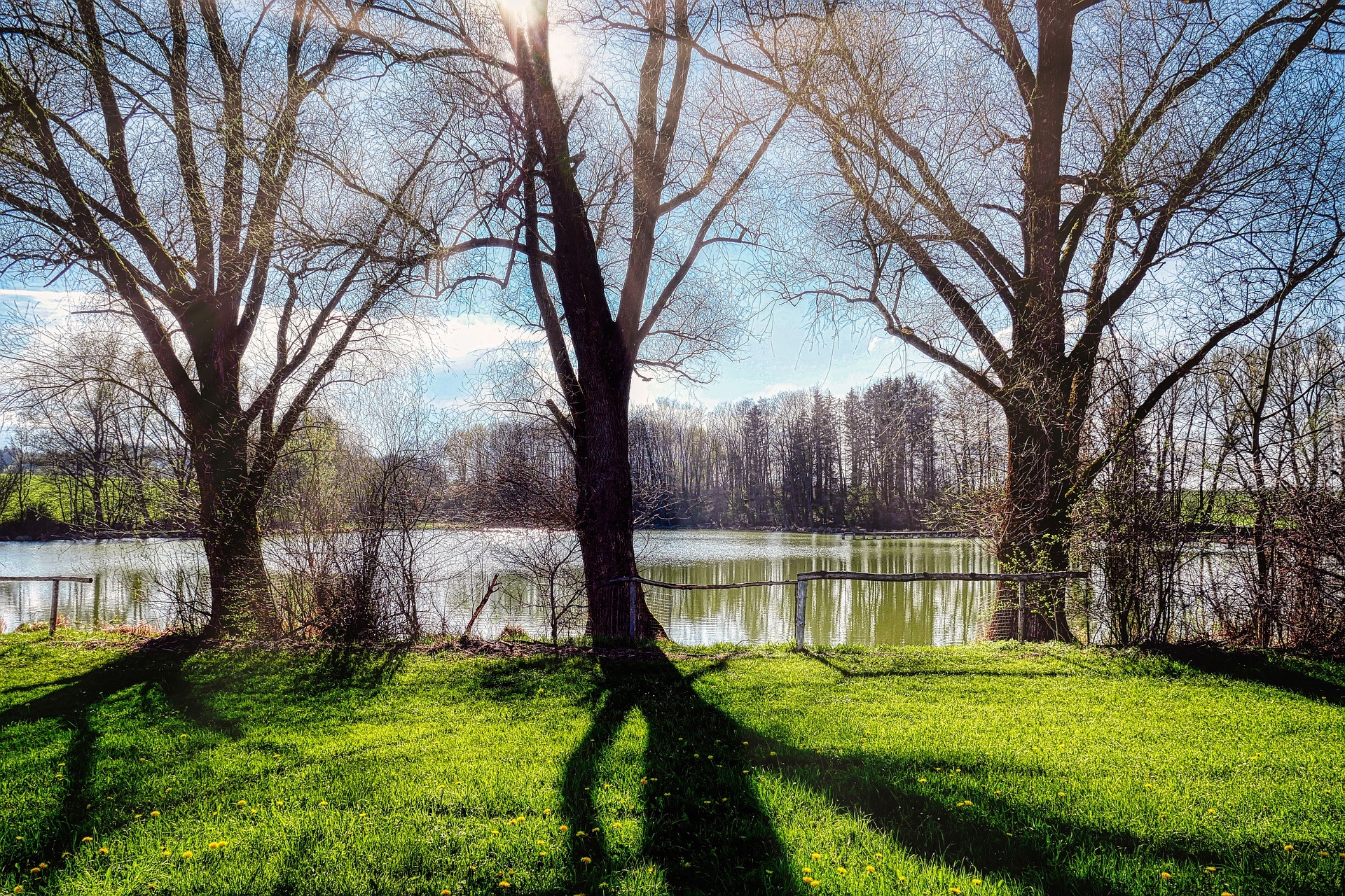 Edytor tapety: Drzewa nad jeziorem w słońcu