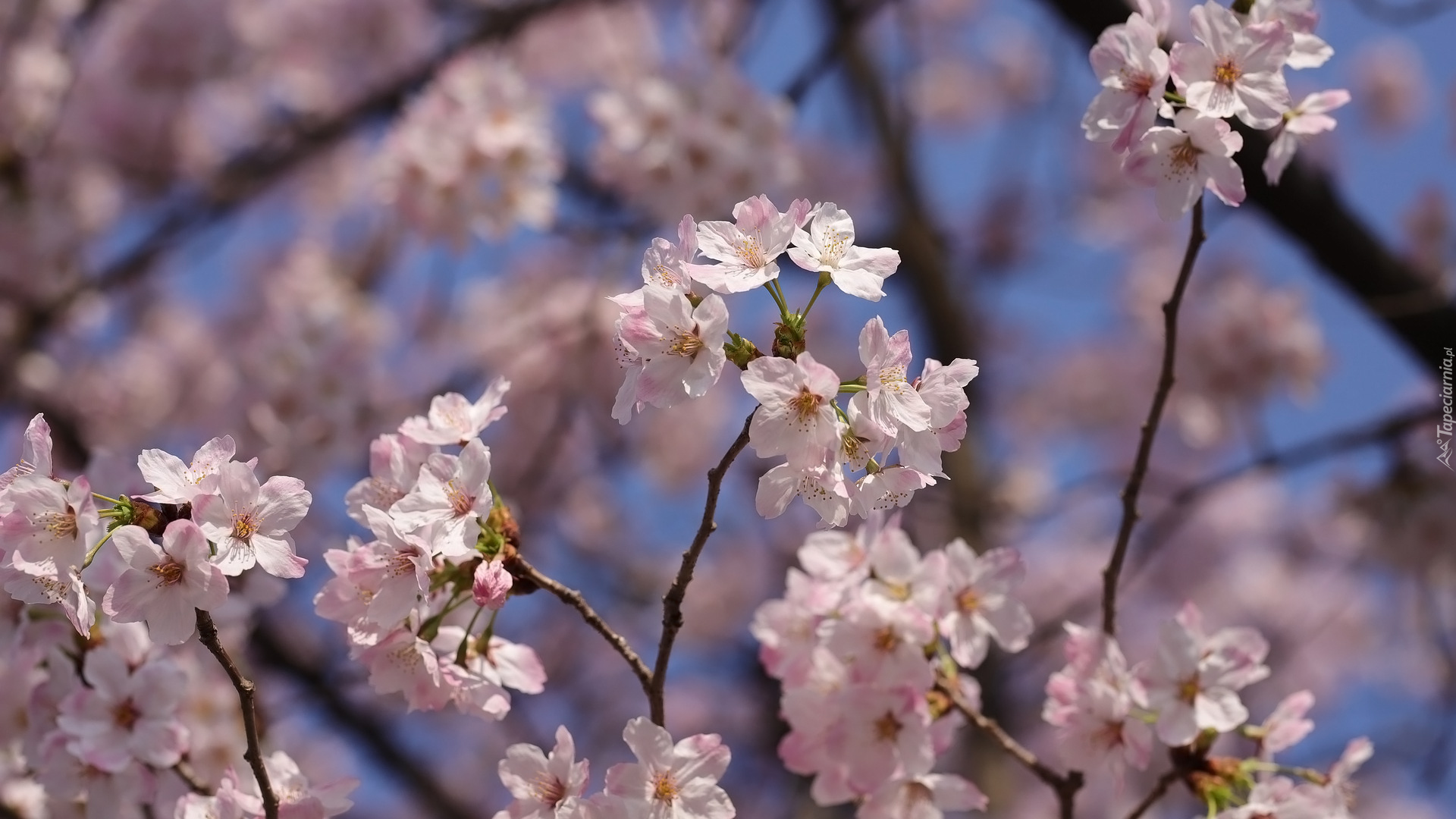 Edytor tapety: Okwiecone gałązki wiśni na rozmytym tle
