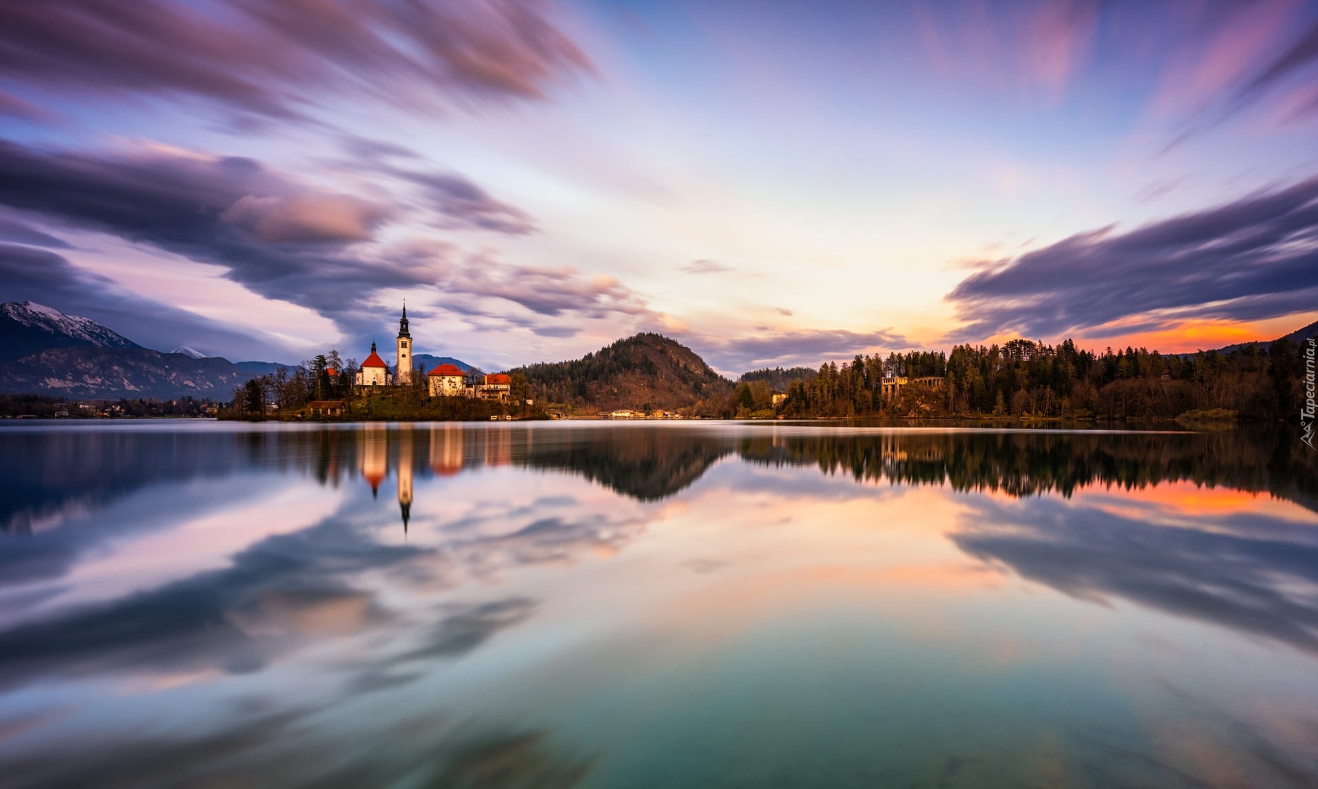 Edytor tapety: Odbicie chmur i gór w Jeziorze Bled