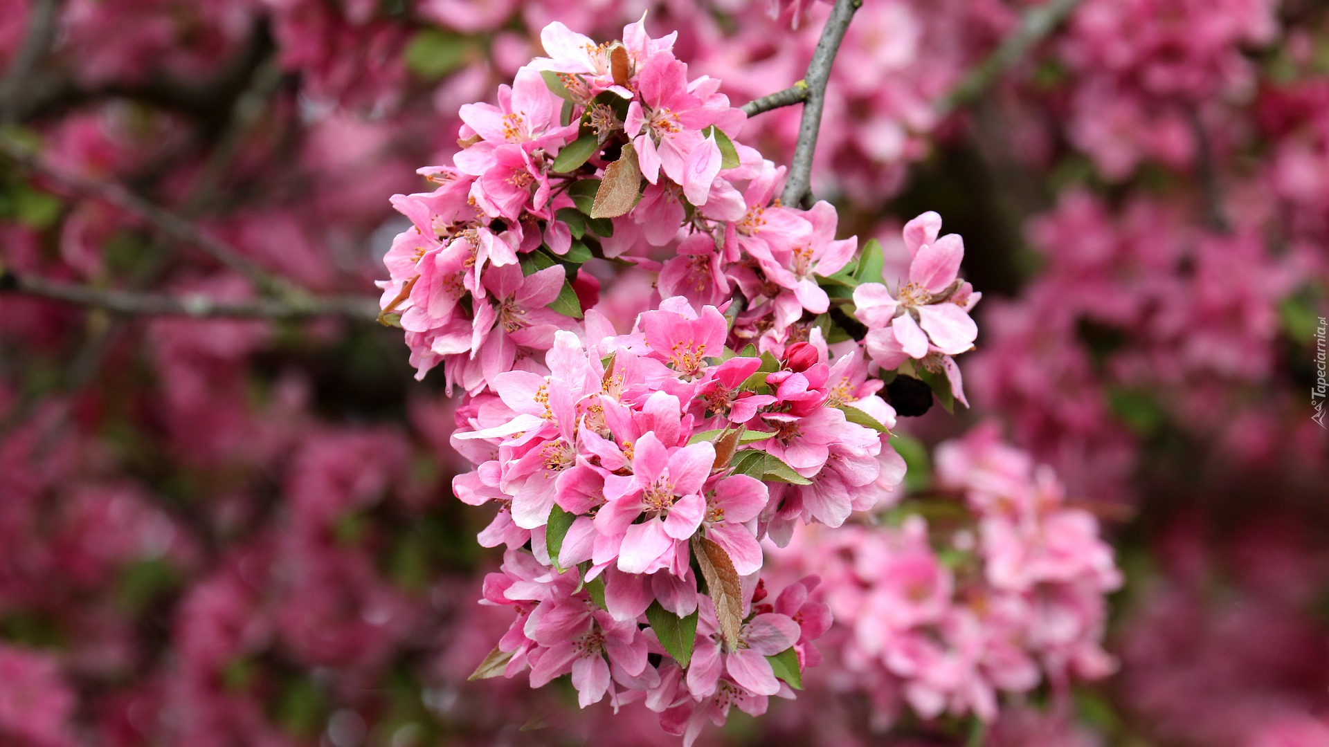Edytor tapety: Gałązka z kwiatami wiśni na rozmytym tle