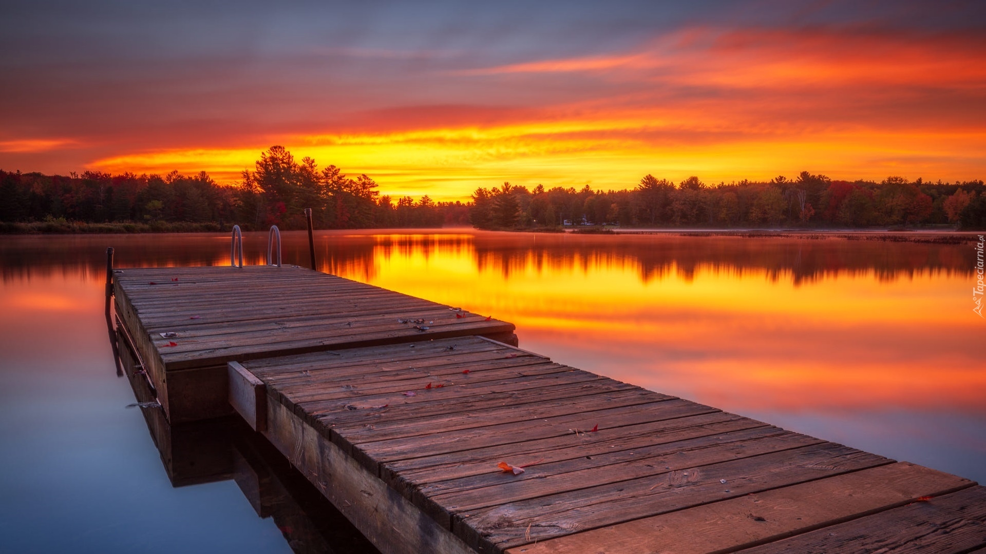 Edytor tapety: Malowniczy zachód słońca nad jeziorem i pomostem
