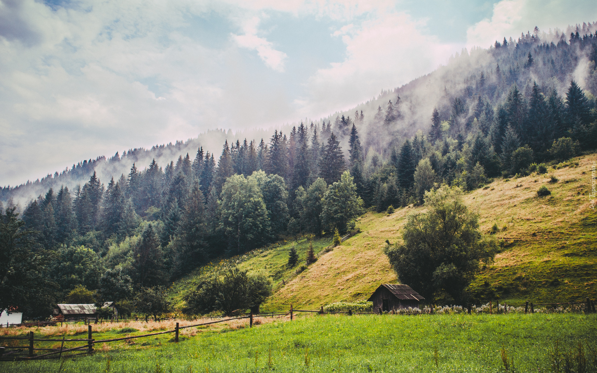 Edytor tapety: Domy i łąka pod zalesionymi górami we mgle