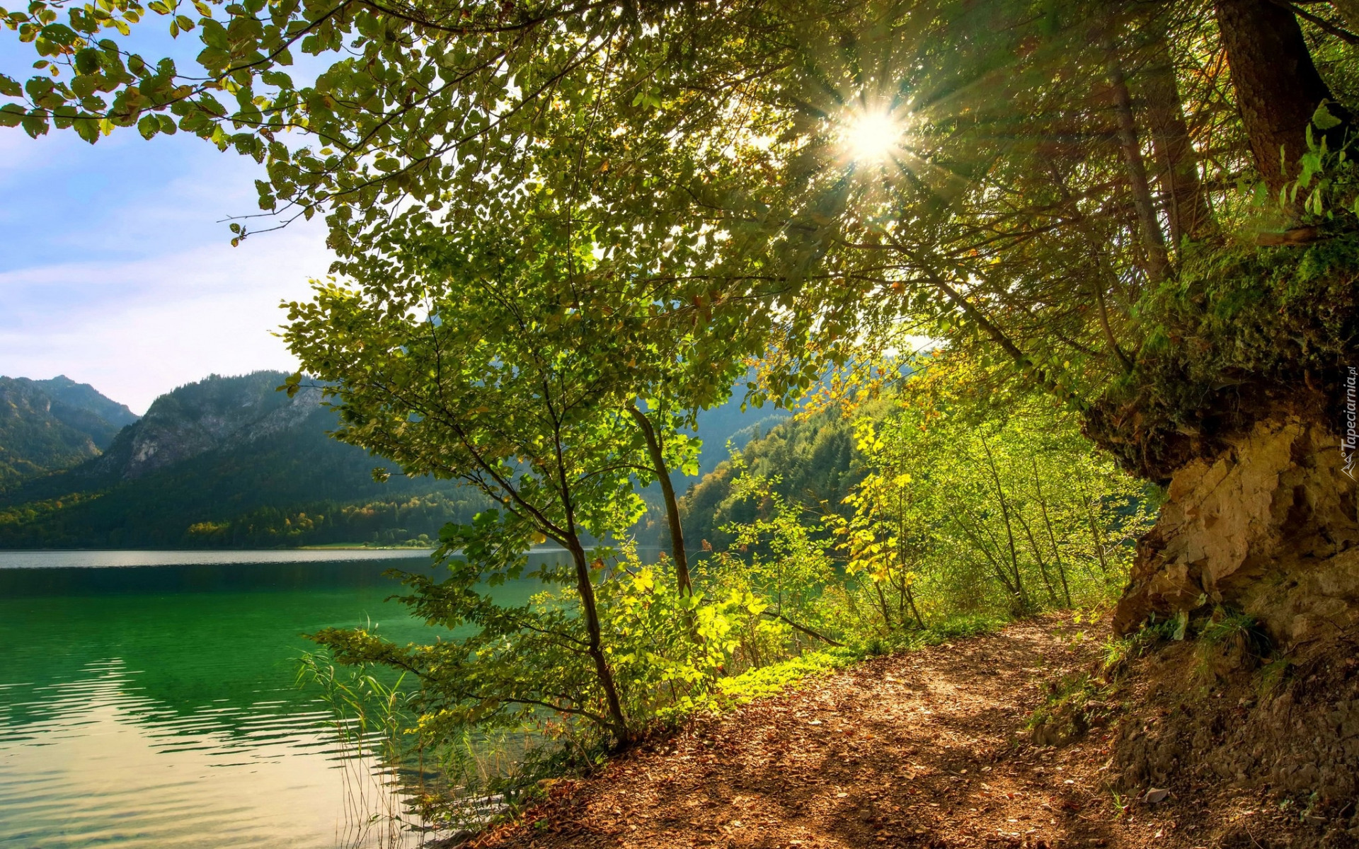 Edytor tapety: Drzewa na skarpie nad jeziorem w promieniach słońca