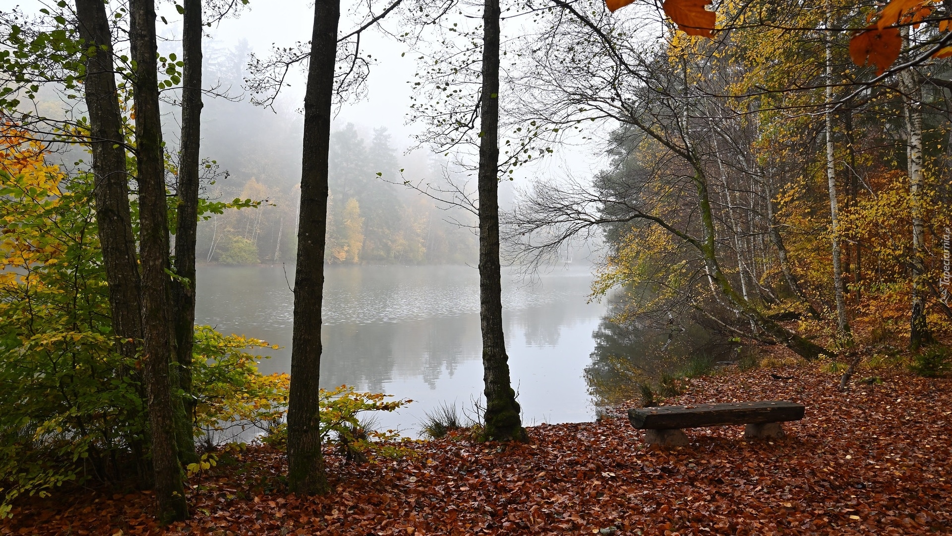 Edytor tapety: Ławka na opadłych liściach przy brzegu zamglonego jeziora