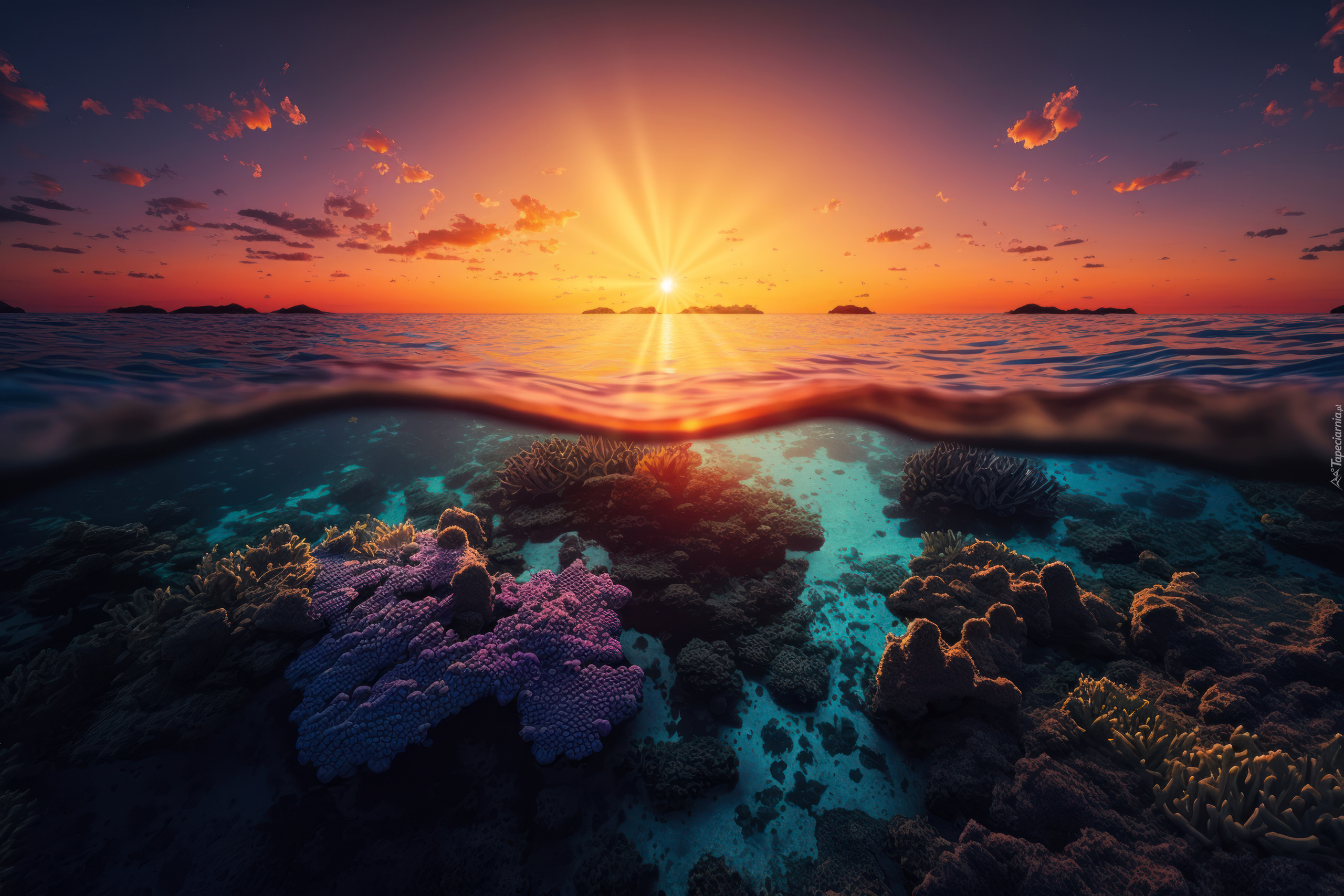 Edytor tapety: Koralowce w morzu na tle wschodu słońca