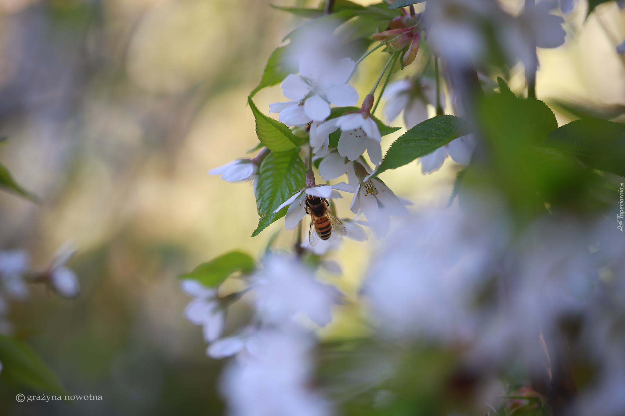 Edytor tapety: Pszczoła na białych kwiatach drzewa owocowego