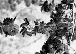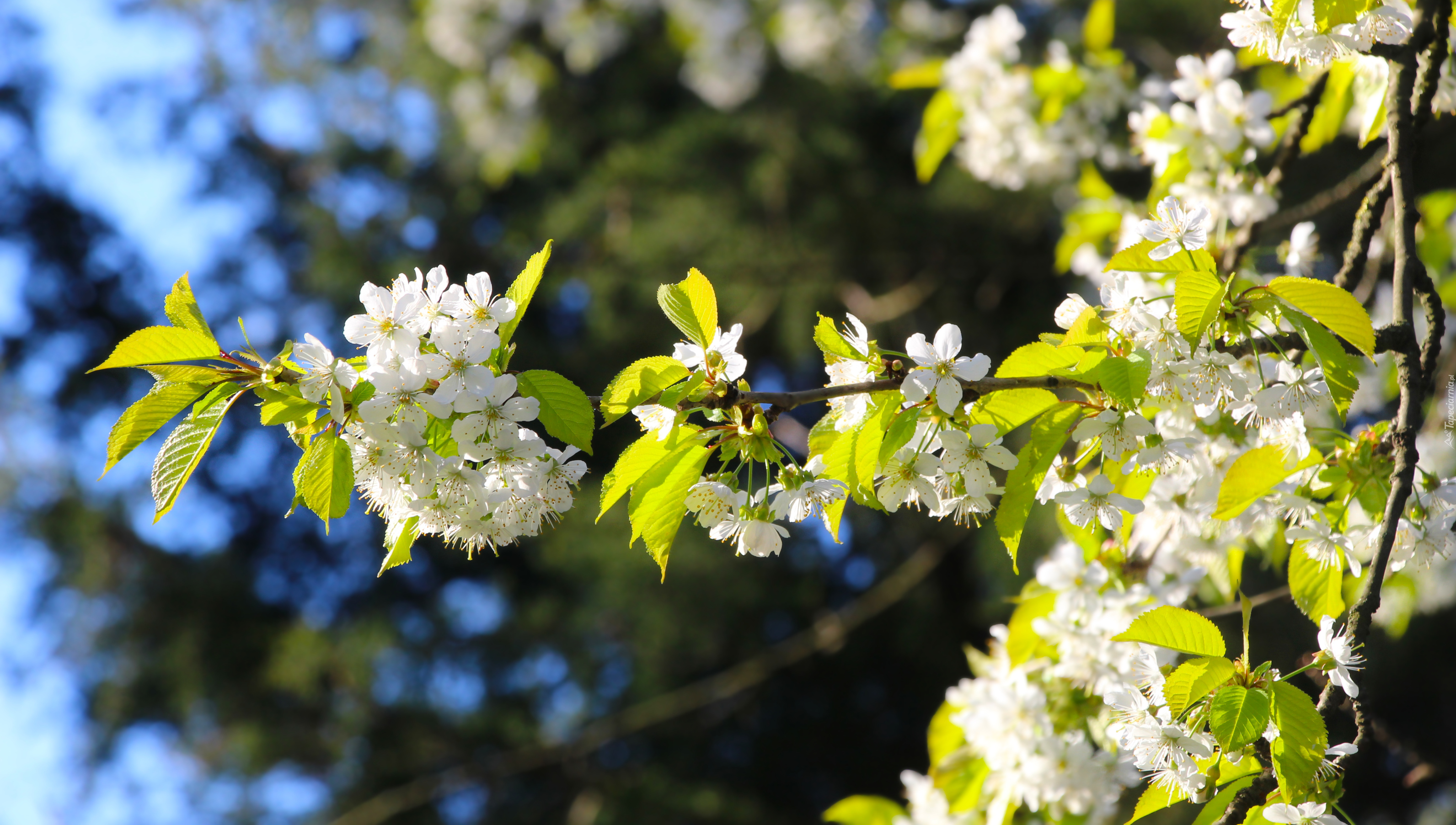 Edytor tapety: Rozświetlone słońcem gałązki drzewa owocowego z białymi kwiatami