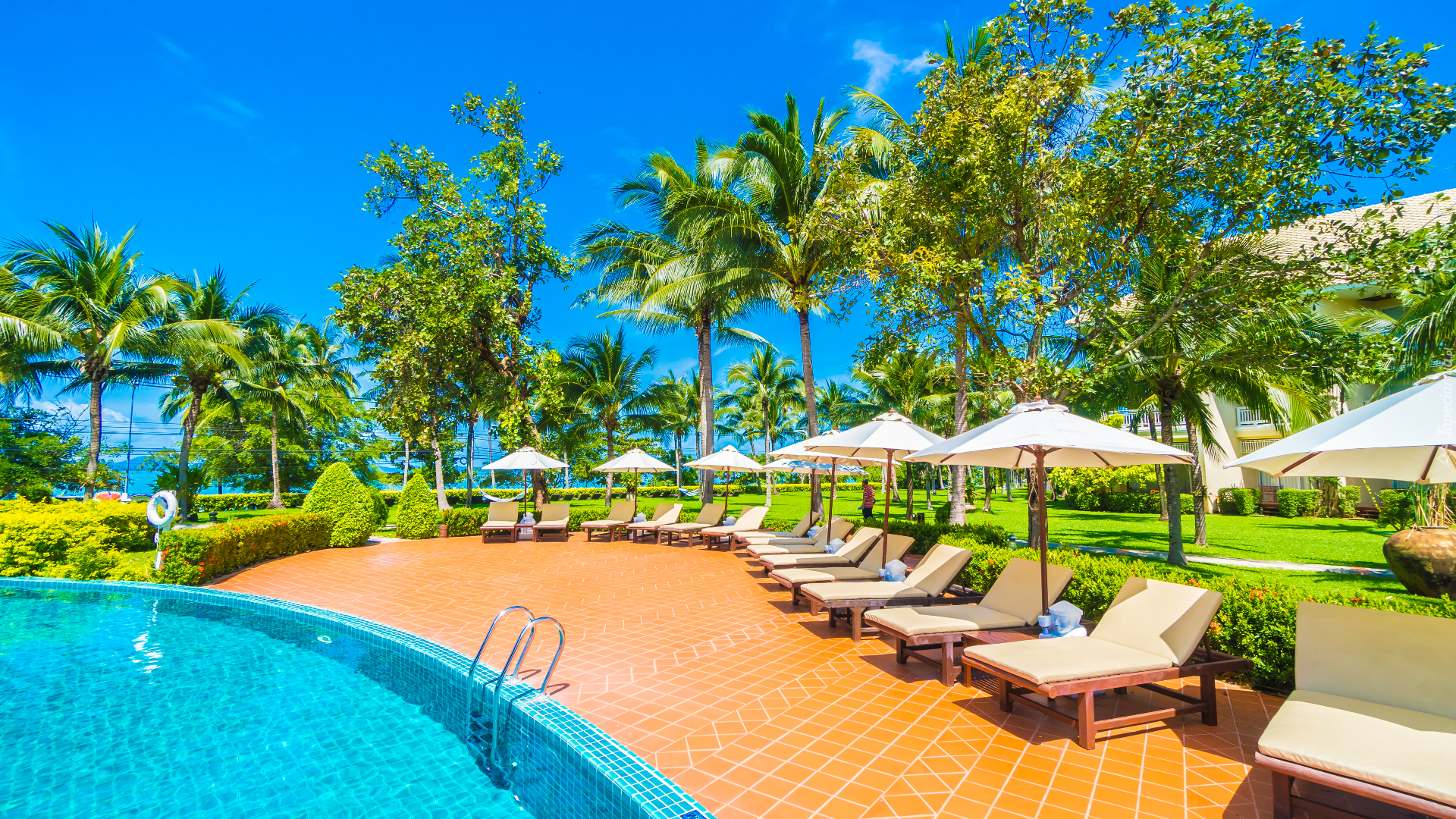 Edytor tapety: Leżaki pod parasolami na basenie w tropikach