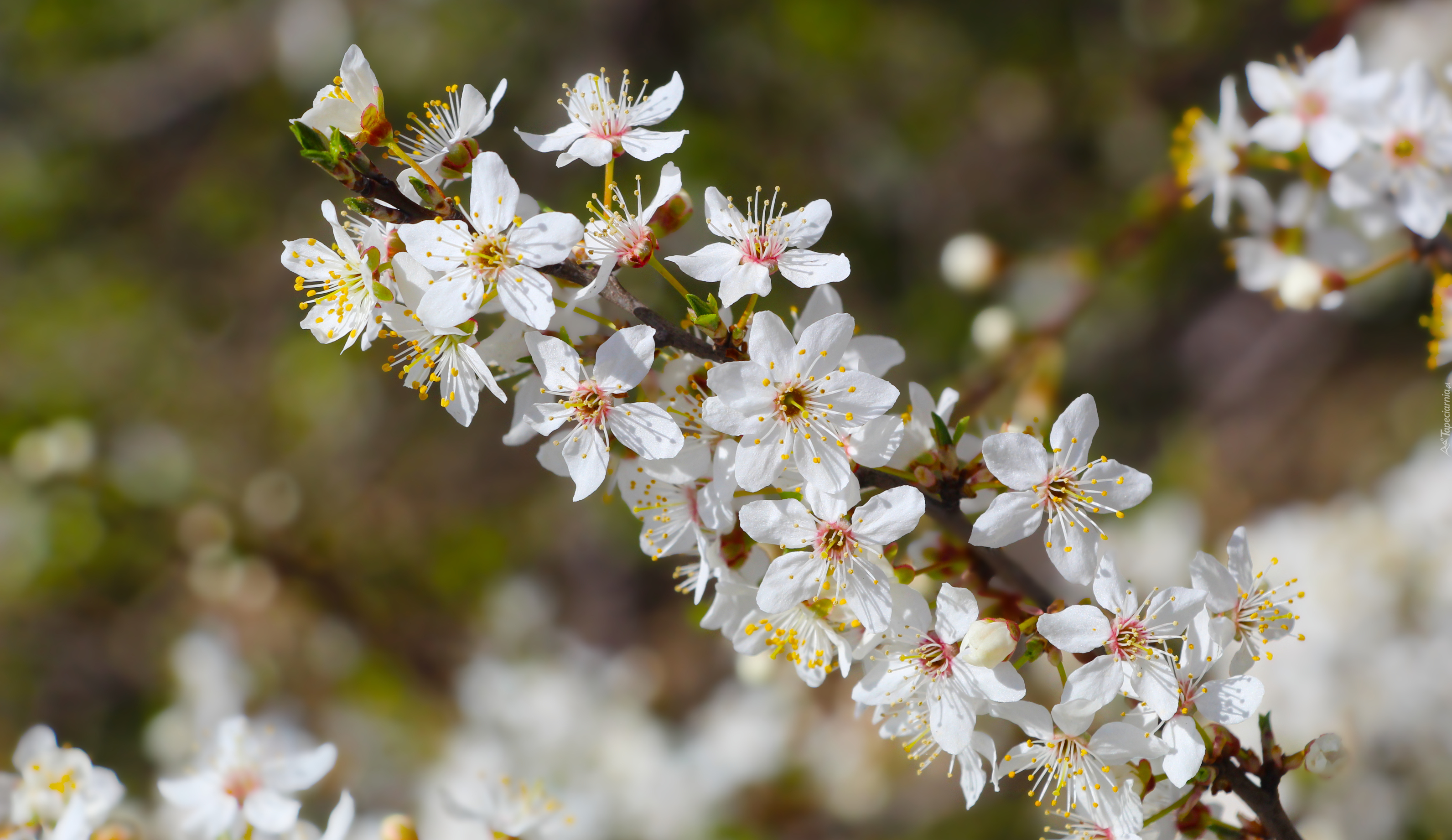 Edytor tapety: Rozświetlone białe kwiaty drzewa owocowego na gałązce