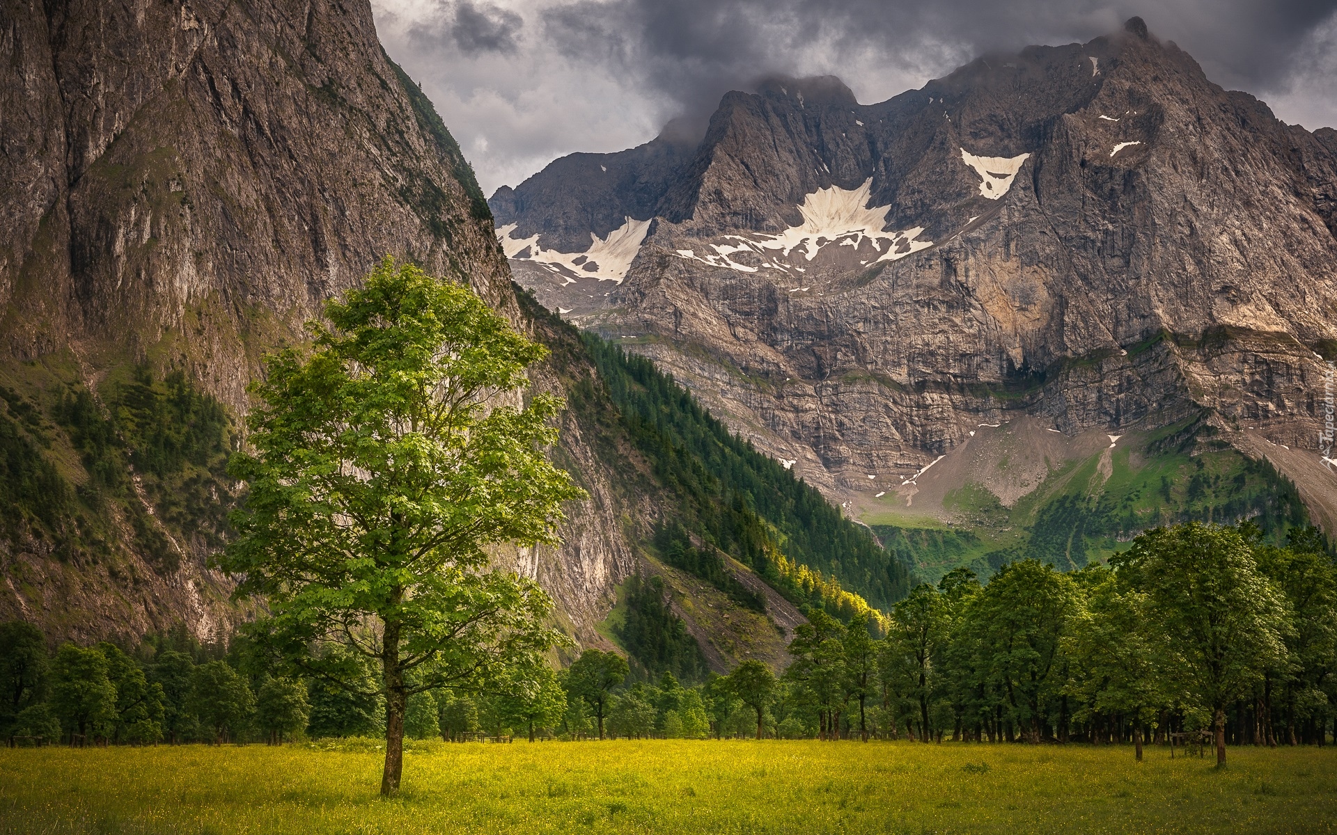 Edytor tapety: Drzewa na łące pod górami
