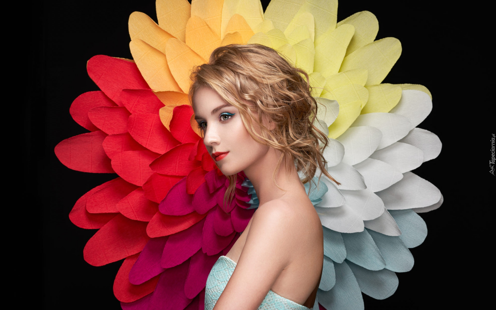 Edytor tapety: Blondynka na tle dużego kolorowego kwiatu