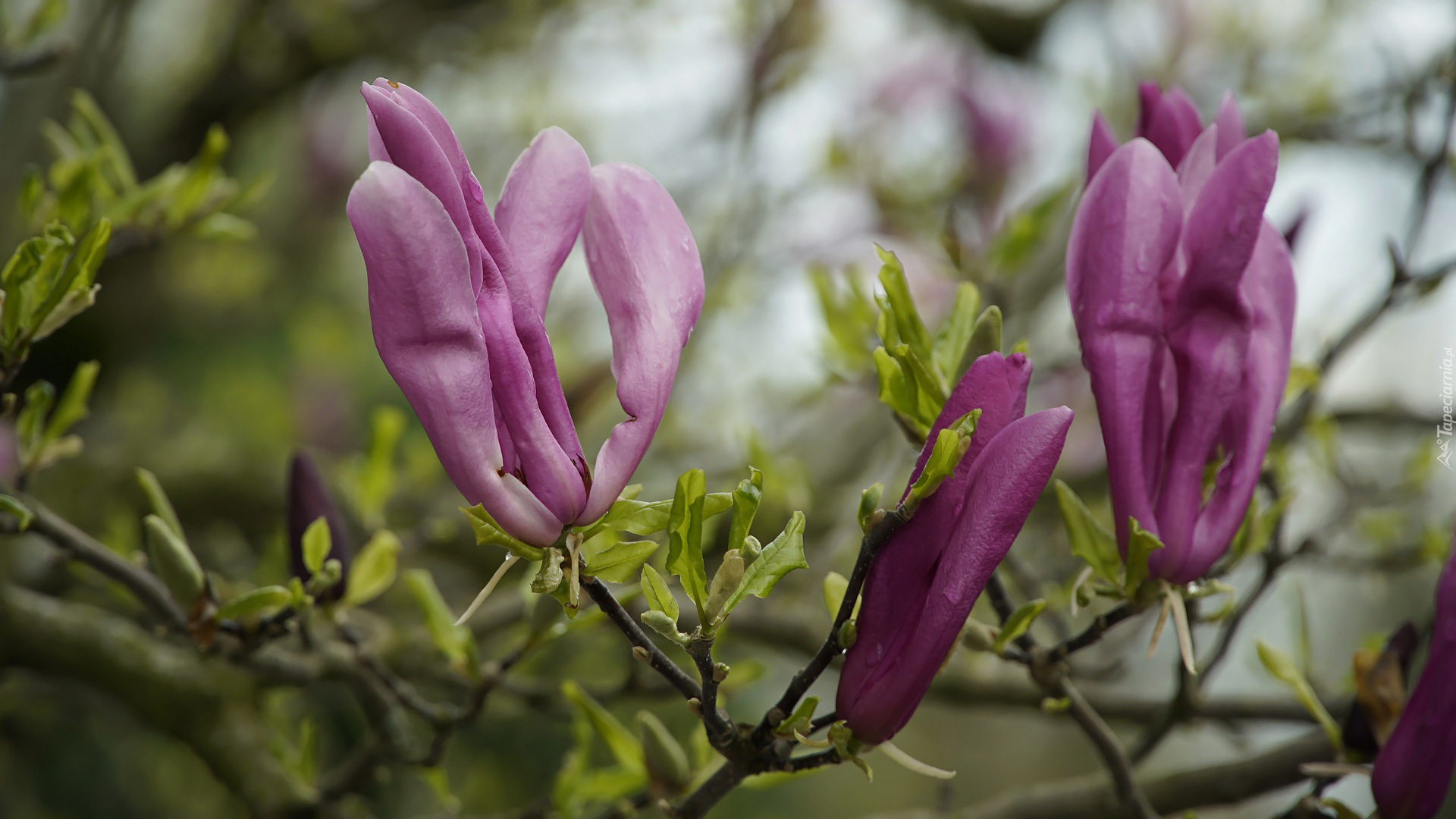 Edytor tapety: Ciemnoróżowe kwiaty magnolii z listkami