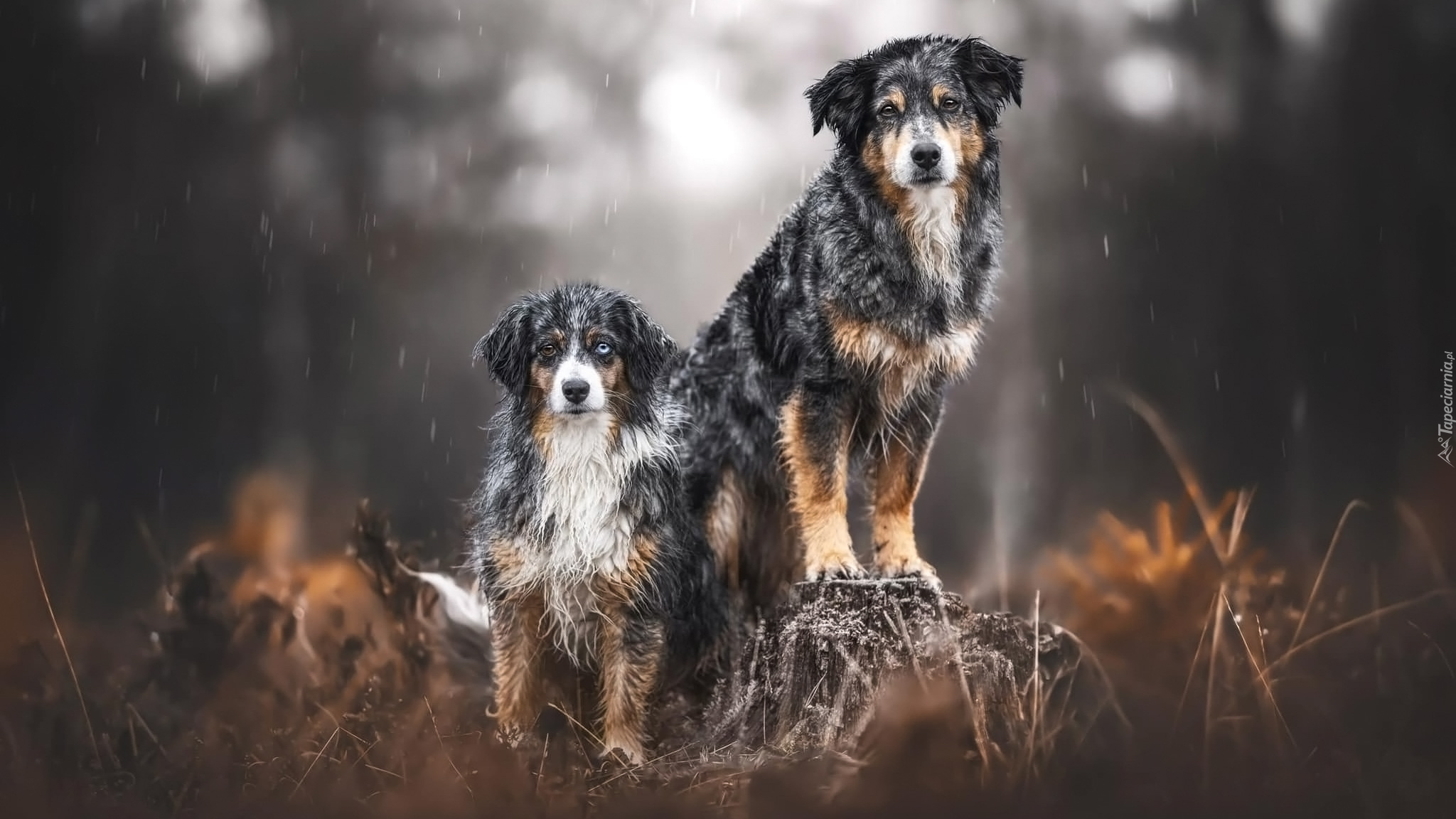 Edytor tapety: Dwa mokre psy w padającym deszczu